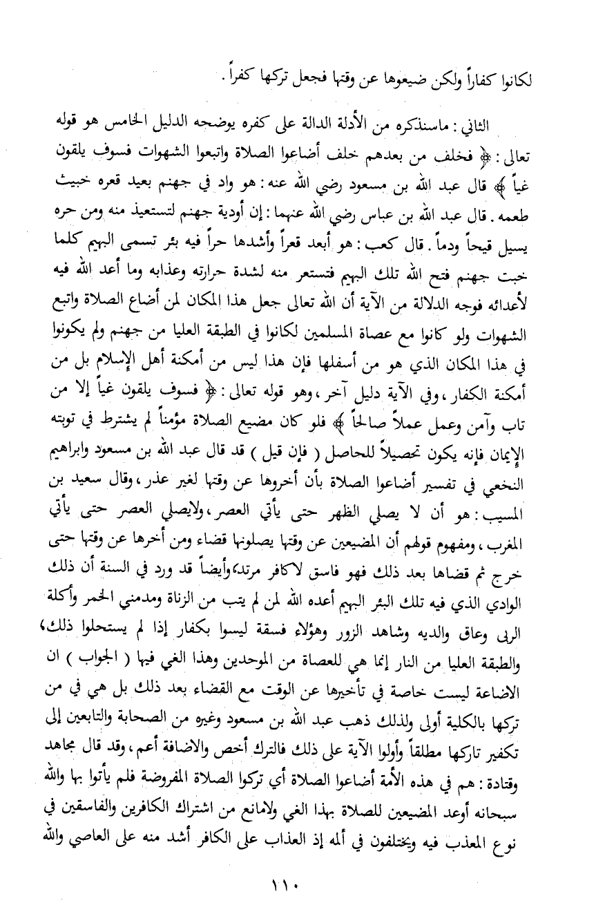 الثاني: ما سنذكره من الأدلة الدالة على كفره يوضحه الدليل الخامس هو قوله تعالى: {فَخَلَفَ مِنْ بَعْدِهِمْ خَلْفٌ أَضَاعُوا الصَّلاةَ وَاتَّبَعُوا الشَّهَوَاتِ فَسَوْفَ يَلْقَوْنَ غَيّاً} قال عبد الله بن مسعود رضي الله عنه: هو واد في جهنم بعيد قعره خبيث طعمه. قال عبد الله بن عباس رضي الله عنهما: إن أودية جهنم لتستعيذ منه ومن حره يسيل قيحاً ودماً. قال كعب: هو أبعد قعراً وأشدها حراً فيه بئر تسمى البهيم كلما خبت جهنم فتح الله تلك البهيم فتستعر منه لشدة حرارته وعذابه وما أعد الله فيه لأعدائه فوجه الدلالة من الآية أن الله تعالى جعل هذا المكان لمن أضاع الصلاة واتبع الشهوات ولو كانوا مع عصاة المسلمين لكانوا في الطبقة العليا من جهنم ولم يكونوا في هذا المكان الذي هو من أسفلها فإن هذا ليس من أمكنة أهل الإسلام بل من أمكنة الكفار، وفي الآية دليل آخر، وهو قوله تعالى: {فَسَوْفَ يَلْقَوْنَ غَيّاً إِلاَّ مَنْ تَابَ وَآمَنَ وَعَمِلَ صَالِحاً} فلو كان مضيع الصلاة مؤمناً لم يشترط في توبته الإيمان فإنه يكون تحصيلاً للحاصل (فإن قيل) قد قال عبد الله بن مسعود وإبراهيم النخعي في تفسير أضاعوا الصلاة بأن أخروها عن وقتها لغير عذر، وقال سعيد بن المسيب: هو أن لا يصلي الظهر حتى يأتي العصر، ولا يصلي العصر حتى يأتي المغرب، ومفهوم قولهم أن المضيعين عن وقتها يصلونها قضاء ومن أخرها عن وقتها حتى خرج ثم قضاها بعد ذلك فهو فاسق لا كافر مرتد، وأيضاً قد ورد في السنة أن ذلك الوادي الذي فيه تلك البئر البهيم أعده الله لمن لم يتب من الزناة ومدمني الخمر وأكلة الربى وعاق والديه وشاهد الزور وهؤلاء فسقة ليسوا بكفار إذا لم يستحلوا ذلك، والطبقة العليا من النار إنما هي للعصاة من الموحدين وهذا الغي فيها (الجواب) ان الإضاعة ليست خاصة في تأخيرها عن الوقت مع القضاء بعد ذلك بل هي في من تركها بالكلية أولى ولذلك ذهب عبد الله بن مسعود وغيره من الصحابة والتابعين إلى تكفير تاركها مطلقاً وأولوا الآية على ذلك فالترك أخص والإضافة أعم، وقد قال مجاهد وقتادة: هم في هذه الأمة أضاعوا الصلاة أي تركوا الصلاة المفروضة فلم يأتوا بها والله سبحانه أوعد المضيعين للصلاة بهذا الغي ولا مانع من اشتراك الكافرين والفاسقين في نوع المعذب فيه ويختلفون في ألمه إذ العذاب على الكافر أشد منه على العاصي والله