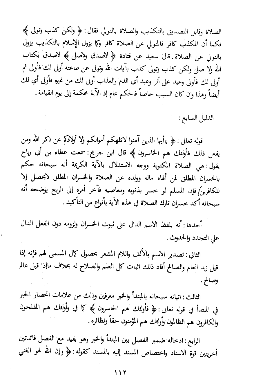 قوله تعالى: {يَا أَيُّهَا الَّذِينَ آمَنُوا لا تُلْهِكُمْ أَمْوَالُكُمْ وَلا أَوْلادُكُمْ عَنْ ذِكْرِ اللَّهِ وَمَنْ يَفْعَلْ ذَلِكَ فَأُولَئِكَ هُمُ الْخَاسِرُونَ} قال ابن جريج: سمعت عطاء بن أبي رباح يقول: هي الصلاة المكتوبة ووجه الاستدلال بالآية الكريمة أنه سبحانه حكم بالخسران المطلق لمن ألهاه ماله وولده عن الصلاة والخسران المطلق لا يحصل إلا للكافرين، فإن المسلم لو خسر بذنوبه ومعاصيه فآخر أمره إلى الربح يوضحه أنه سبحانه أكد خسران تارك الصلاة في هذه الآية بأنواع من التأكيد.