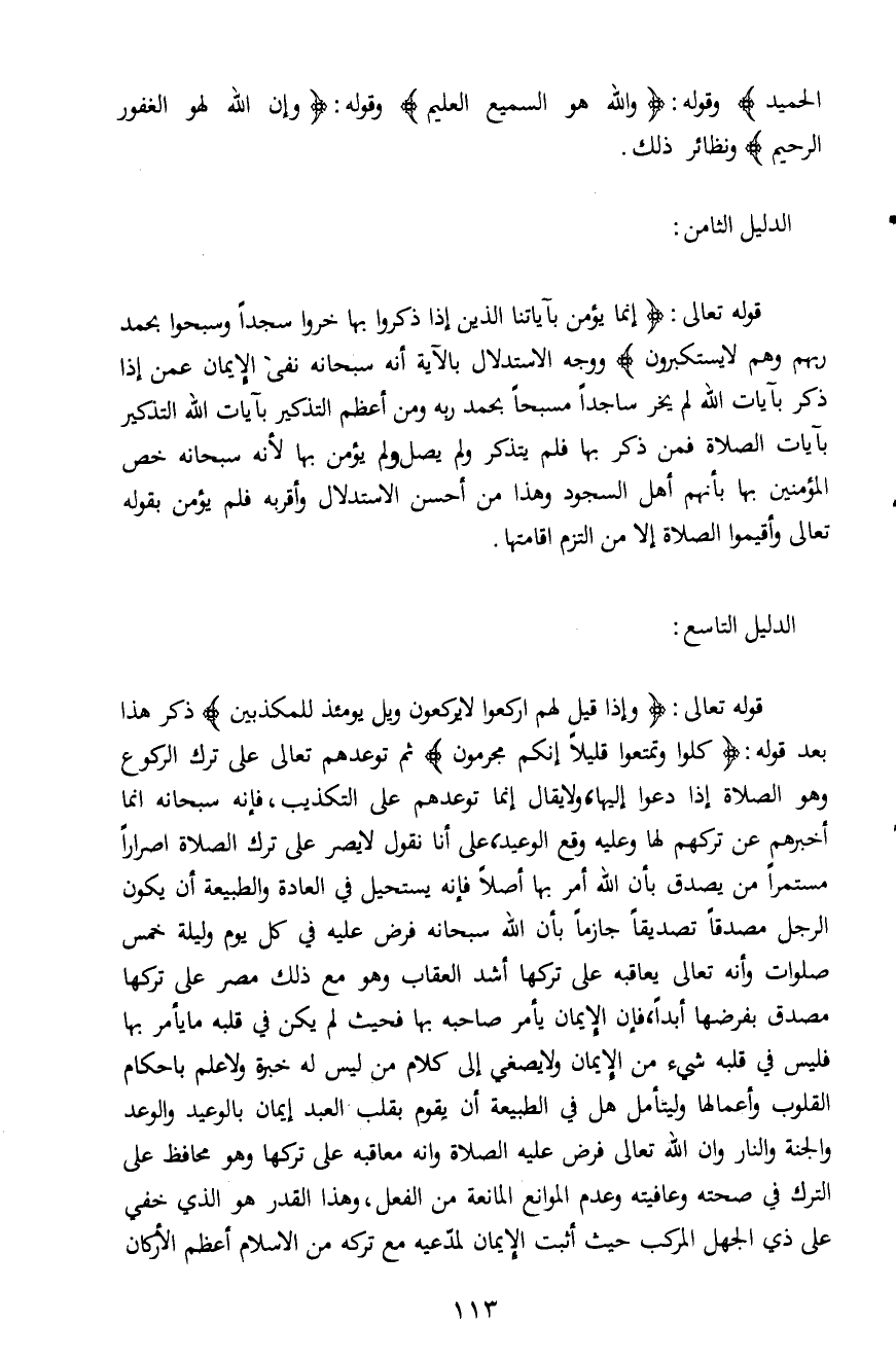 قوله تعالى: {إِنَّمَا يُؤْمِنُ بِآياتِنَا الَّذِينَ إِذَا ذُكِّرُوا بِهَا خَرُّوا سُجَّداً وَسَبَّحُوا بِحَمْدِ رَبِّهِمْ وَهُمْ لا يَسْتَكْبِرُونَ} ووجه الاستدلال بالآية أنه سبحانه نفى الإيمان عمن إذا ذكر بآيات الله لم يخر ساجداً مسبحاً بحمد ربه ومن أعظم التذكير بآيات الله التذكير بآيات الصلاة فمن ذكر بها فلم يتذكر ولم يصل ولم يؤمن بما لأنه سبحانه خص المؤمنين بها بأنهم أهل السجود وهذا من أحسن الاستدلال وأقربه فلم يؤمن بقوله تعالى وأقيموا الصلاة إلا من التزم إقامتها.
