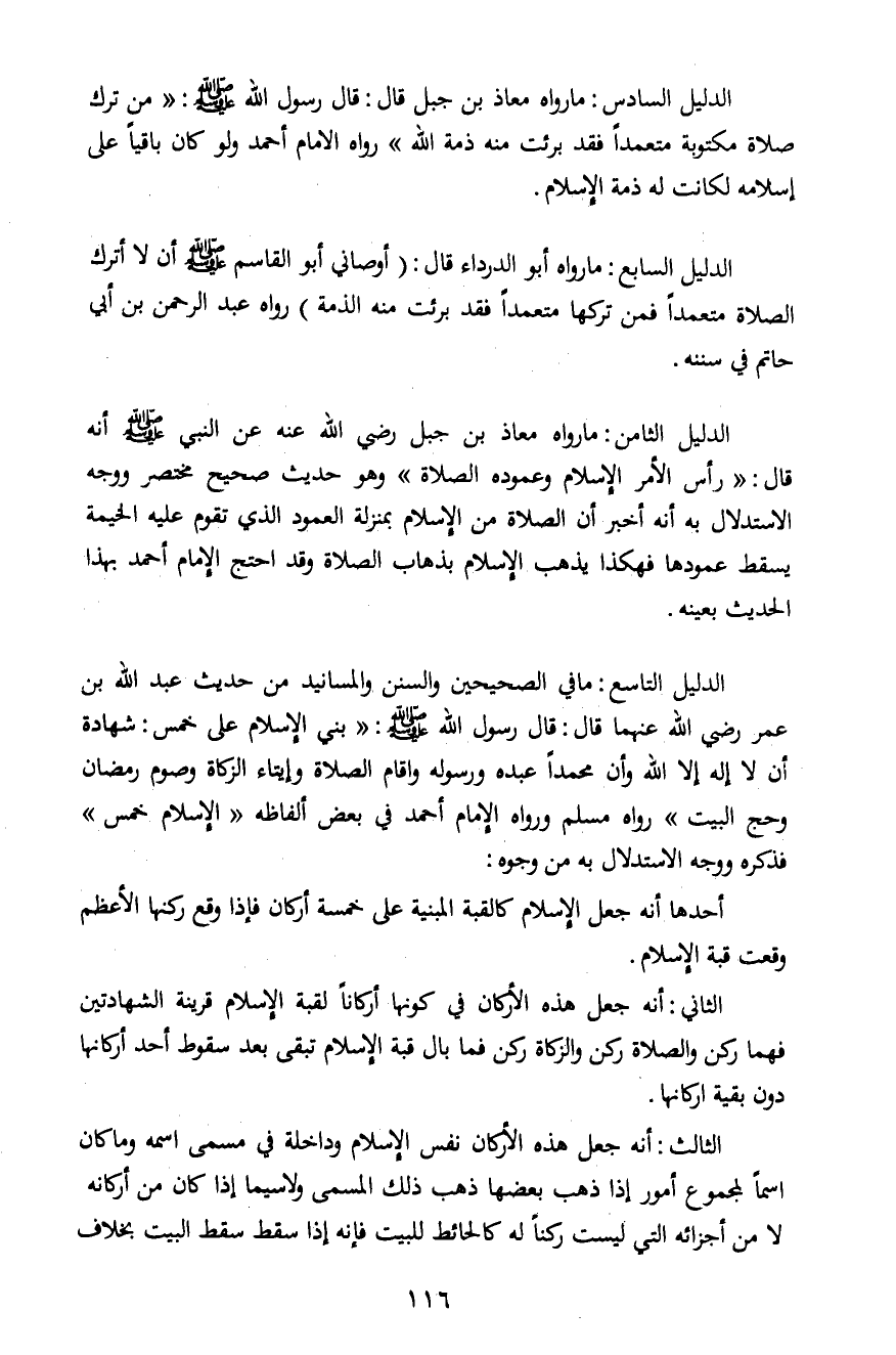 الدليل السادس: ما رواه معاذ بن جبل قال: قال رسول الله صلى الله عليه وسلم: "من ترك صلاة مكتوبة متعمداً فقد برئت منه ذمة الله" رواه الإمام أحمد ولو كان باقياً على إسلامه لكانت له ذمة الإسلام.