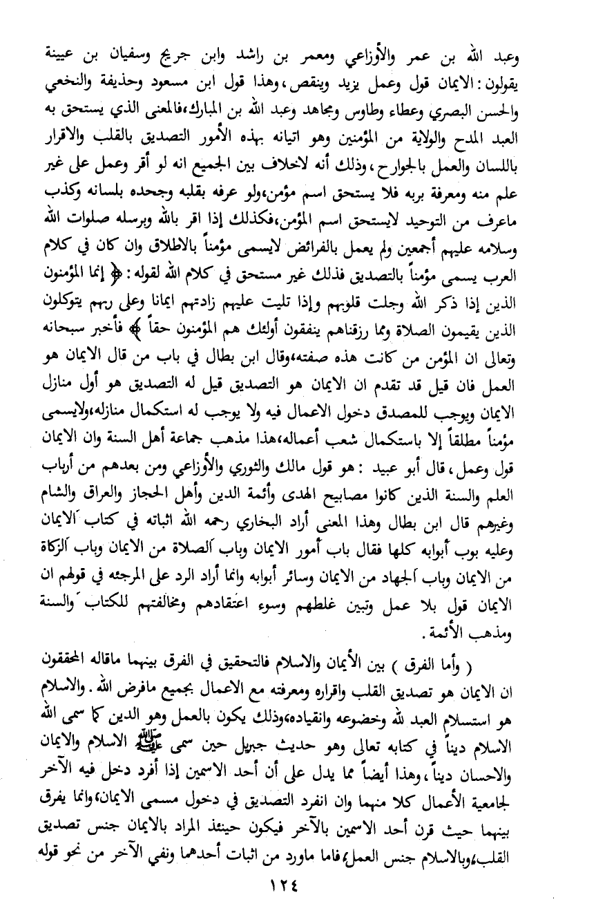 (وأما الفرق) بين الإيمان والإسلام فالتحقيق في الفرق بينهما ما قاله المحققون ان الإيمان هو تصديق القلب وإقراره ومعرفته مع الأعمال بجميع ما فرض الله. والإسلام هو استسلام العبد لله وخضوعه وانقياده، وذلك يكون بالعمل وهو الدين كما سمى الله الإسلام ديناً في كتابه تعالى وهو حديث جبريل حين سمى صلى الله عليه وسلم الإسلام والإيمان والإحسان ديناً، وهذا أيضاً مما يدل على أن أحد الاسمين إذا أفرد دخل فيه الآخر لجامعية الأعمال كلا منهما وان انفرد التصديق في دخول مسمى الإيمان، وإنما يفرق بينهما حيث قرن أحد الاسمين بالآخر فيكون حينئذ المراد بالإيمان جنس تصديق القلب، وبالإسلام جنس العمل، فأما ما ورد من إثبات أحدهما ونفي الآخر من نحو قوله
