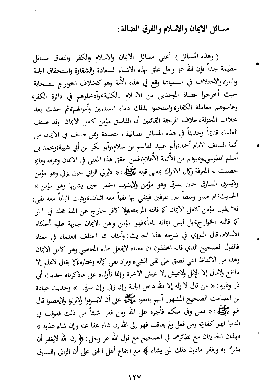 (وهذه المسائل) أعني مسائل الإيمان والإسلام والكفر والنفاق مسائل عظيمة جداً فإن الله عز وجل علق بهذه الأشياء السعادة والشقاوة واستحقاق الجنة والنار، والاختلاف في مسمياتها وقع في هذه الأمة وهو كخلاف الخوارج للصحابة حيث أخرجوا عصاة الموحدين من الإسلام بالكلية، وأدخلوهم في دائرة الكفر، وعاملوهم معاملة الكفار، واستحلوا بذلك دماء المسلمين وأموالهم، ثم حدث بعد خلاف المعتزلة، خلاف المرجئة القائلين أن الفاسق مؤمن كامل الإيمان. وقد صنف العلماء قديماً وحديثاً في هذه المسائل تصانيف متعددة وممن صنف في الإيمان من أئمة السلف الإمام أحمد، وأبو عبيد القاسم بن سلام وأبو بكر بن أبي شيبة، ومحمد بن أسلم الطوسي، وغيرهم من الأئمة الأعلام، فمن حقق هذا المعنى في الإيمان وعرفه ومازه حصلت له المعرفة وكمال الإدراك بمعنى قوله صلى الله عليه وسلم: "لا يزني الزاني حين يزني وهو مؤمن ولا يسرق السارق حين يسرق وهو مؤمن ولا يشرب الخمر حين يشربها وهو مؤمن" الحديث، ثم صار وسطاً بين طرفين فينفي بها نفياً معه إثبات، ويثبت إثباتاً معه نفي، فلا يقول مؤمن كامل الإيمان كما قالته المرجئة، ولا كافر خارج عن الملة مخلد في النار كما قالته الخوارج، بل ليس إيمانه تاماً، فهو مؤمن واهن الإيمان جارية عليه أحكام الإسلام. قال النووي في شرحه هذا الحديث: وأمثاله مما اختلف العلماء في معناه فالقول الصحيح الذي قاله المحققون ان معناه لا يفعل هذه المعاصي وهو كامل الإيمان وهذا من الألفاظ التي تطلق على نفي الشيء ويراد نفي كماله ومختاره، كما يقال لا علم إلا ما نفع ولا مال إلا الإبل ولا عيش إلا عيش الآخرة وإنما تأولناه على ما ذكرناه لحديث أبي ذر وغيره: "من قال لا إله إلا الله دخل الجنة وإن زنى وإن سرق" وحديث عبادة بن الصامت الصحيح المشهور أنهم بايعوه صلى الله عليه وسلم على أن لا يسرقوا ولا يزنوا ولا يعصوا قال لهم صلى الله عليه وسلم: " فمن وفى منكم فأجره على الله ومن فعل شيئاً من ذلك فعوقب في الدنيا فهو كفارته ومن فعل ولم يعاقب فهو إلى الله إن شاء عفا عنه وإن شاء عذبه " فهذان الحديثان مع نظائرهما في الصحيح مع قول الله عز وجل: {إِنَّ اللَّهَ لا يَغْفِرُ أَنْ يُشْرَكَ بِهِ وَيَغْفِرُ مَا دُونَ ذَلِكَ لِمَنْ يَشَاء} مع إجماع أهل الحق على أن الزاني والسارق