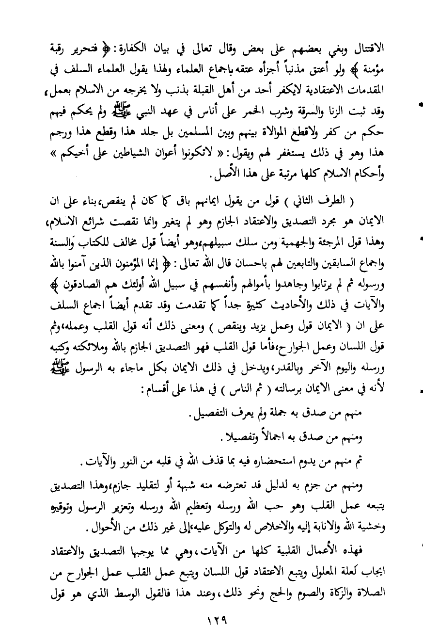 الاقتتال وبغي بعضهم على بعض وقال تعالى في بيان الكفارة: {فَتَحْرِيرُ رَقَبَةٍ مُؤْمِنَةٍ} ولو أعتق مذنباً أجزأه عتقه بإجماع العلماء ولهذا يقول العلماء السلف في المقدمات الاعتقادية لا يكفر أحد من أهل القبلة بذنب ولا يخرجه من الإسلام بعمل، وقد ثبت الزنا والسرقة وشرب الخمر على أناس في عهد النبي صلى الله عليه وسلم ولم يحكم فيهم حكم من كفر ولا قطع الموالاة بينهم وبين المسلمين بل جلد هذا وقطع هذا ورجم هذا وهو في ذلك يستغفر لهم ويقول: " لا تكونوا أعوان الشياطين على أخيكم" وأحكام الإسلام كلها مرتبة على هذا الأصل.