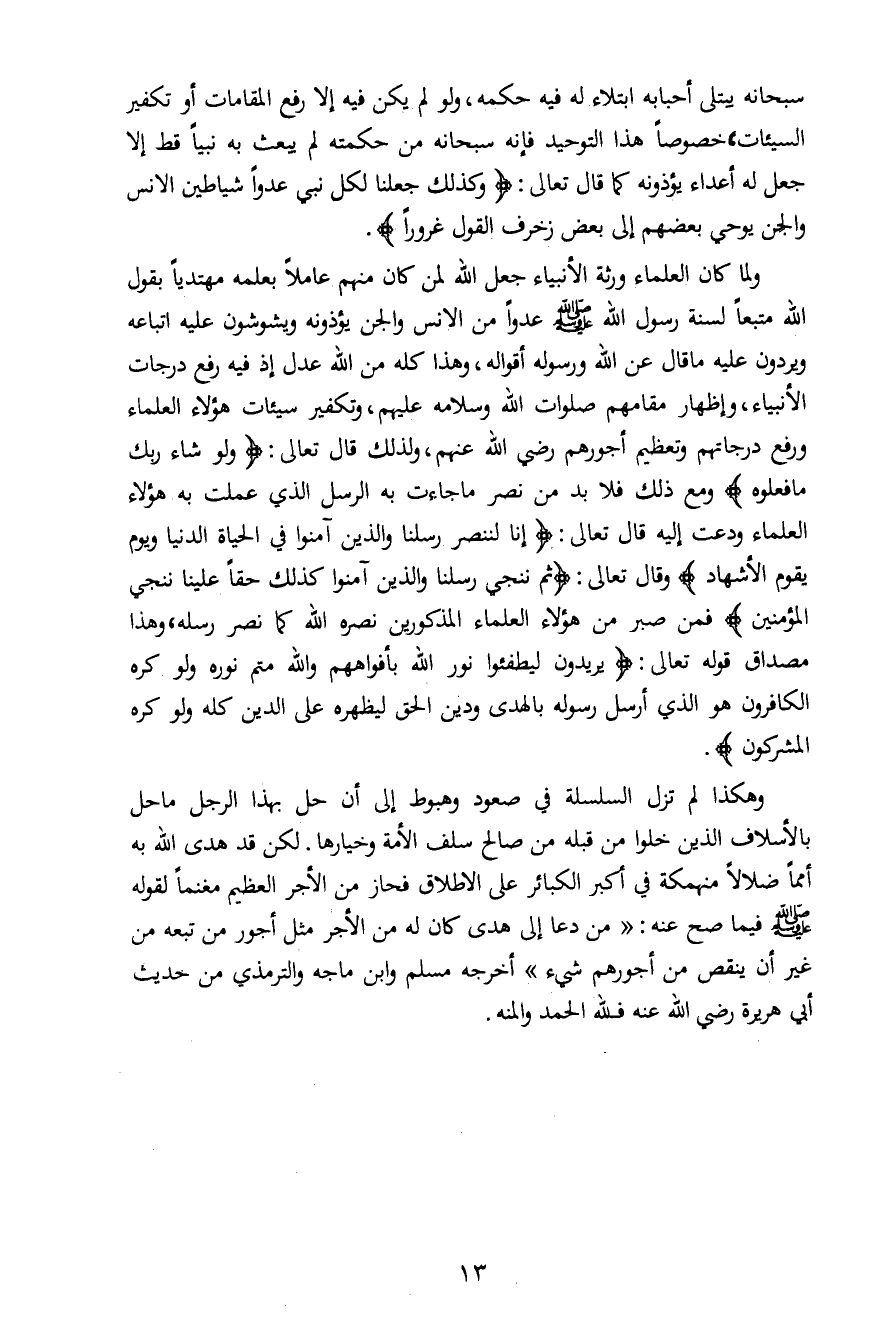 ولما كان العلماء ورثة الأنبياء جعل الله لمن كان منهم عاملاً بعلمه مهتدياً بقول الله متبعاً لسنة رسول الله صلى الله عليه وسلم عدواً من الإنس والجن يؤذونه ويشوشون عليه اتباعه ويردون عليه ما قال عن الله ورسوله أقواله، وهذا كله من الله عدل إذ فيه رفع درجات الأنبياء، وإظهار مقامهم صلوات الله وسلامه عليهم، وتكفير سيئات هؤلاء العلماء ورفع درجاتهم وتعظيم أجورهم رضي الله عنهم، ولذلك قال تعالى: {وَلَوْ شَاءَ رَبُّكَ مَا فَعَلُوهُ} ومع ذلك فلا بد من نصر ما جاءت به الرسل الذي عملت به هؤلاء العلماء ودعت إليه قال تعالى: {إِنَّا لَنَنْصُرُ رُسُلَنَا وَالَّذِينَ آمَنُوا فِي الْحَيَاةِ الدُّنْيَا وَيَوْمَ يَقُومُ الْأَشْهَادُ} وقال تعالى: {ثُمَّ نُنَجِّي رُسُلَنَا وَالَّذِينَ آمَنُوا كَذَلِكَ حَقّاً عَلَيْنَا نُنْجِ الْمُؤْمِنِينَ} فمن صبر من هؤلاء العلماء المذكورين نصره الله كما نصر رسله، وهذا مصداق قوله تعالى: {يُرِيدُونَ لِيُطْفِئُوا نُورَ اللَّهِ بِأَفْوَاهِهِمْ وَاللَّهُ مُتِمُّ نُورِهِ وَلَوْ كَرِهَ الْكَافِرُونَ هُوَ الَّذِي أَرْسَلَ رَسُولَهُ بِالْهُدَى وَدِينِ الْحَقِّ لِيُظْهِرَهُ عَلَى الدِّينِ كُلِّهِ وَلَوْ كَرِهَ الْمُشْرِكُونَ} .