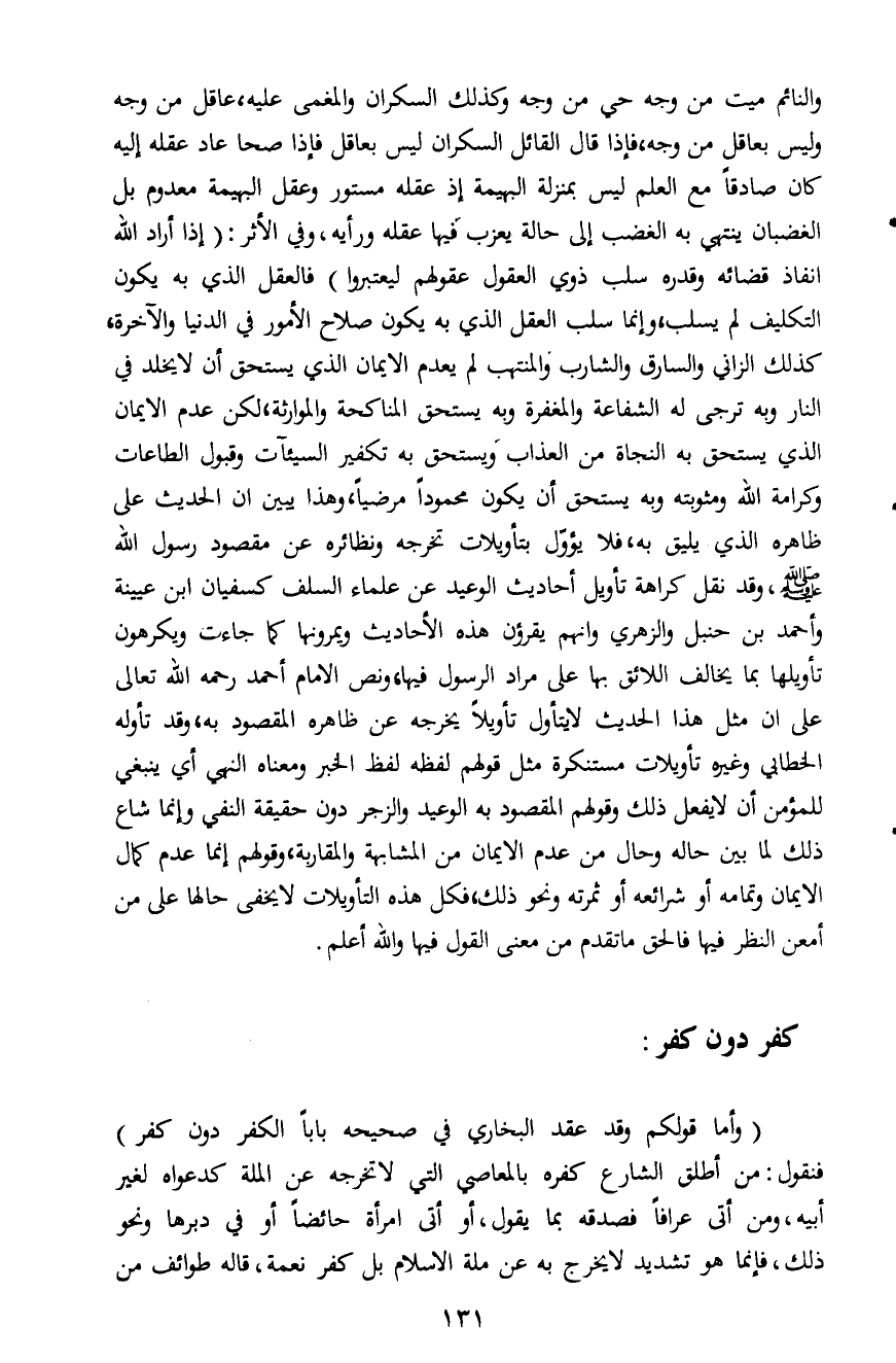 (وأما قولكم وقد عقد البخاري في صحيحه باباً الكفر دون كفر) فنقول: من أطلق الشارع كفره بالمعاصي التي لا تخرجه عن الملة كدعواه لغير أبيه، ومن أتى عرافاً فصدقه بما يقول، أو أتى امرأة حائضاً أو في دبرها ونحو ذلك، فإنما هو تشديد لا يخرج به عن ملة الإسلام بل كفر نعمة، قاله طوائف من