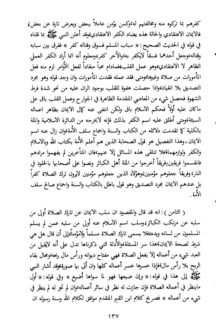 (الثامن) : انه قد قال والمقصود ان سلب الإيمان عن تارك الصلاة أولى من سلبه عن مرتكب الكبائر، وسلب اسم الإسلام عنه أولى من سلبه عمن لم يسلم المسلمون من لسانه ويده، فلا يسمى تارك الصلاة مسلماً ولا مؤمناً، إلى أن قال هل هي شرط لصحة الإيمان، هذا سر المسألة، والأدلة التي ذكرناها تدل على أنه لا يقبل من العبد شيء من أعماله إلا بفعل الصلاة فهي مفتاح ديوانه ورأس مال ربحه، ومحال بقاء الربح بلا رأس مال، فإذا خسرها خسر أعماله كلها وان أتى بها صورة، وقد أشار النبي صلى الله عليه وسلم إلى هذا في قوله: "وإن ضيعها فهو لما سواها أضيع" وفي قوله: " أول ما ينظر في أعماله الصلاة فإن جازت له نظر في سائر أعماله، وان لم تجز له لم ينظر إلى شيء من أعماله" فصريح كلام ابن القيم المتقدم موافق لكلام الله وسنة رسوله ان