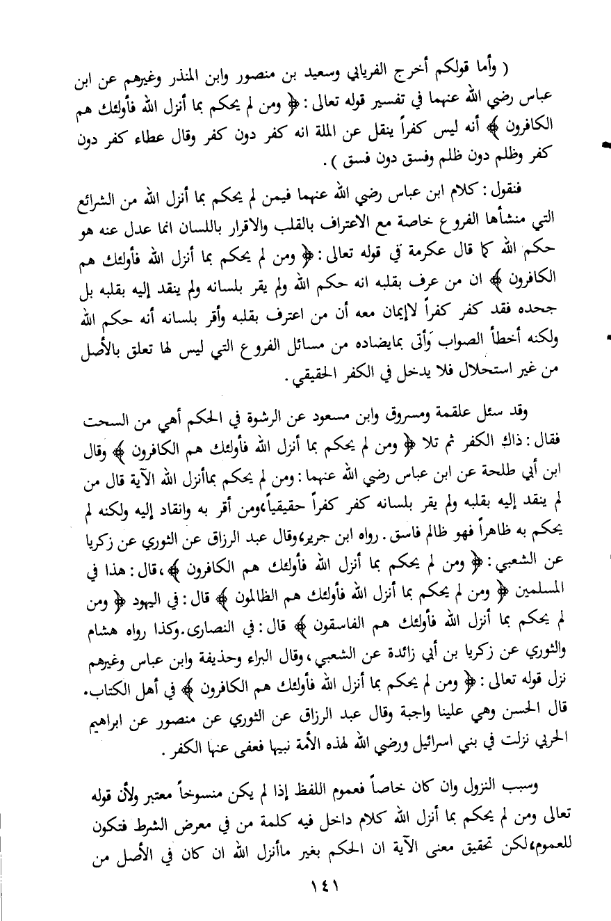 (وأما قولكم أخرج الفريابي وسعيد بن منصور وابن المنذر وغيرهم عن ابن عباس رضي الله عنهما في تفسير قوله تعالى: {وَمَنْ لَمْ يَحْكُمْ بِمَا أَنْزَلَ اللَّهُ فَأُولَئِكَ هُمُ الْكَافِرُونَ} أنه ليس كفراً ينقل عن الملة انه كفر دون كفر وقال عطاء كفر دون كفر وظلم دون ظلم وفسق دون فسق) .