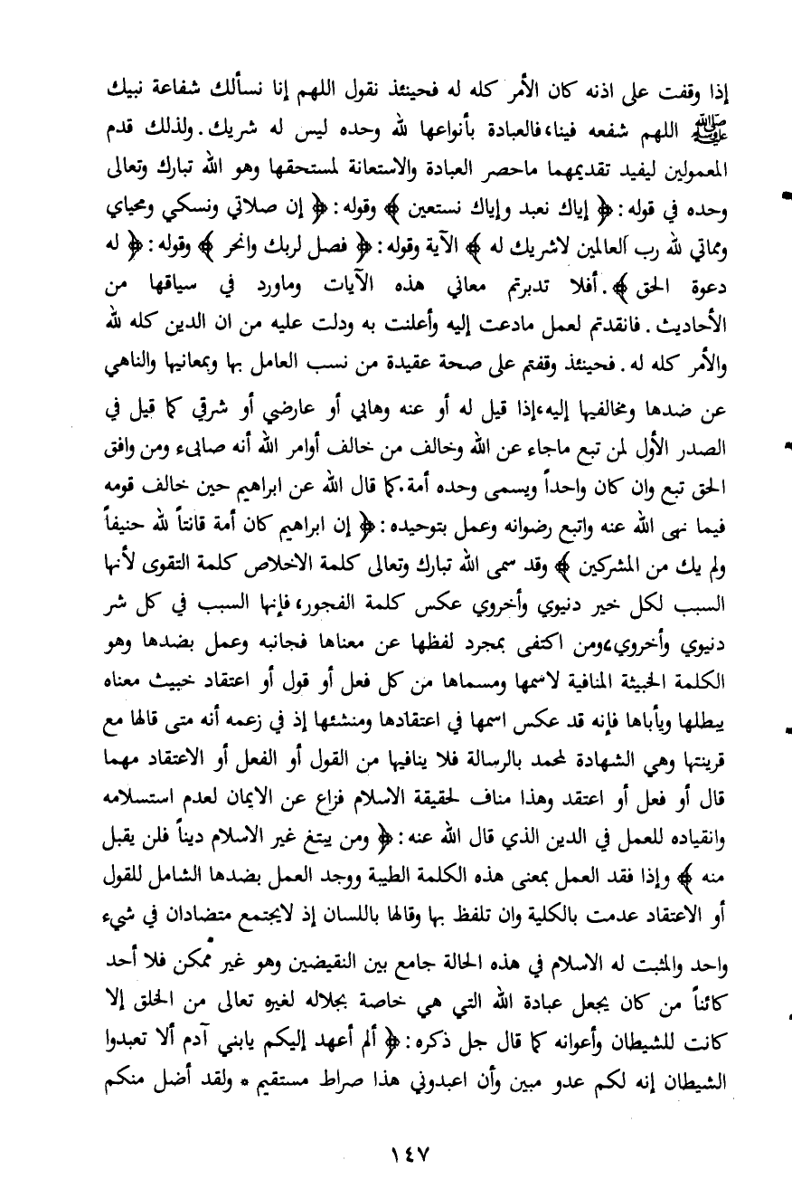 أفلا تدبرتم معاني هذه الآيات وما ورد في سياقها من الأحاديث. فانقدتم لعمل ما دعت إليه وأعلنت به ودلت عليه من ان الدين كله لله والأمر كله له. فحينئذ وقفتم على صحة عقيدة من نسب العامل بها وبمعانيها والناهي عن ضدها ومخالفيها إليه، إذا قيل له أو عنه وهابي أو عارضي أو شرقي كما قيل في الصدر الأول لمن تبع ما جاء عن الله وخالف من خالف أوامر الله أنه صابئ ومن وافق الحق تبع وان كان واحداً ويسمى وحده أمة. كما قال الله عن إبراهيم حين خالف قومه فيما نهى الله عنه واتبع رضوانه وعمل بتوحيده: {إِنَّ إِبْرَاهِيمَ كَانَ أُمَّةً قَانِتاً لِلَّهِ حَنِيفاً وَلَمْ يَكُ مِنَ الْمُشْرِكِينَ} وقد سمى الله تبارك وتعالى كلمة الإخلاص كلمة التقوى لأنها السبب لكل خير دنيوي وأخروي عكس كلمة الفجور، فإنها السبب في كل شر دنيوي وأخروي، ومن اكتفى بمجرد لفظها عن معناها فجانبه وعمل بضدها وهو الكلمة الخبيثة المنافية لاسمها ومسماها من كل فعل أو قول أو اعتقاد خبيث معناه يبطلها ويأباها فإنه قد عكس اسمها في اعتقادها ومنشئها إذ في زعمه أنه متى قالها مع قرينتها وهي الشهادة لمحمد بالرسالة فلا ينافيها من القول أو الفعل أو الاعتقاد مهما قال أو فعل أو اعتقد وهذا مناف لحقيقة الإسلام فزاع عن الإيمان لعدم استسلامه وانقياده للعمل في الدين الذي قال الله عنه: {وَمَنْ يَبْتَغِ غَيْرَ الْأِسْلامِ دِيناً فَلَنْ يُقْبَلَ مِنْهُ} وإذا فقد العمل بمعنى هذه الكلمة الطيبة ووجد العمل بضدها الشامل للقول أو الاعتقاد عدمت بالكلية وان تلفظ بها وقالها باللسان إذ لا يجتمع متضادان في شيء واحد والمثبت له الإسلام في هذه الحالة جامع بين النقيضين وهو غير ممكن فلا أحد كائناً من كان يجعل عبادة الله التي هي خاصة بجلاله لغيره تعالى من الخلق إلا كانت للشيطان وأعوانه كما قال جل ذكره: {أَلَمْ أَعْهَدْ إِلَيْكُمْ يَا بَنِي آدَمَ أَنْ لا تَعْبُدُوا الشَّيْطَانَ إِنَّهُ لَكُمْ عَدُوٌّ مُبِينٌ * وَأَنِ اعْبُدُونِي هَذَا صِرَاطٌ مُسْتَقِيمٌ * وَلَقَدْ أَضَلَّ مِنْكُمْ