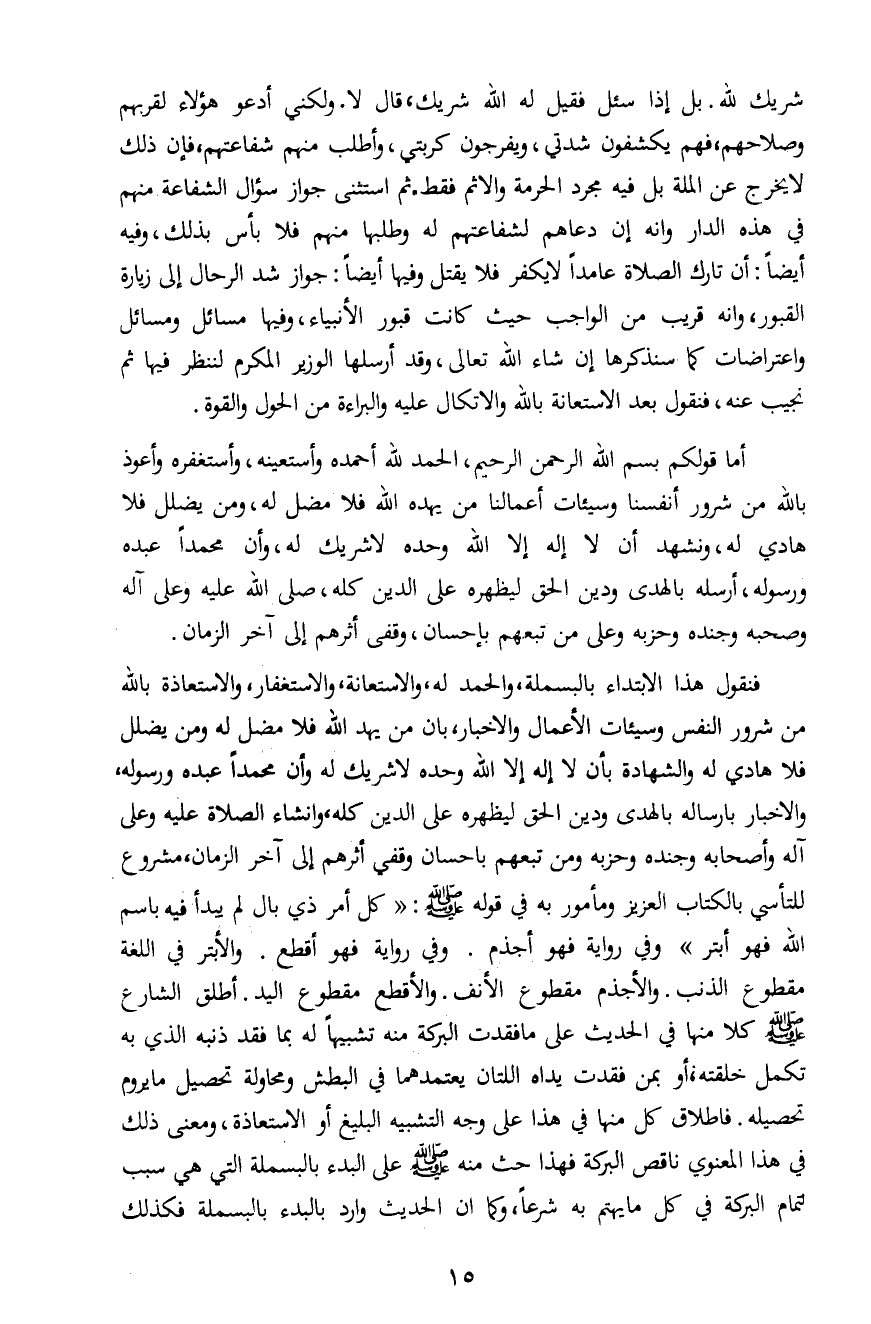 فنقول هذا الابتداء بالبسملة، والحمد له، والاستعانة، والاستغفار، والاستعاذة بالله من شرور النفس وسيئات الأعمال والاخبار، بأن من يهد الله فلا مضل له ومن يضلل فلا هادي له والشهادة بأن لا إله إلا الله وحده لا شريك له وأن محمداً عبده ورسوله، والاخبار بإرساله بالهدى ودين الحق ليظهره على الدين كله، وإنشاء الصلاة عليه وعلى آله وأصحابه وجنده وحزبه ومن تبعهم بإحسان وقفي أثرهم إلى آخر الزمان، مشروع للتأسي بالكتاب العزيز ومأمور به في قوله صلى الله عليه وسلم: "كل أمر ذي بال لم يبدأ فيه باسم الله فهو أبتر" وفي رواية فهو أجذم. وفي رواية فهو أقطع. والأبتر في اللغة مقطوع الذنب. والأجذم مقطوع الأنف. والأقطع مقطوع اليد. أطلق الشارع صلى الله عليه وسلم كلا منها في الحديث على ما فقدت البركة منه تشبيهاً له بما فقد ذنبه الذي به تكمل خلقته؛ أو بمن فقدت يداه اللتان يعتمدهما في البطش ومحاولة تحصيل ما يروم تحصيله. فإطلاق كل منها في هذا على وجه التشبيه البليغ أو الاستعاذة، ومعنى ذلك في هذا المعنوي ناقص البركة فهذا حث منه صلى الله عليه وسلم على البدء بالبسملة التي هي سبب لتمام البركة في كل ما يهتم به شرعاً، وكما أن الحديث وارد بالبدء بالبسملة فكذلك