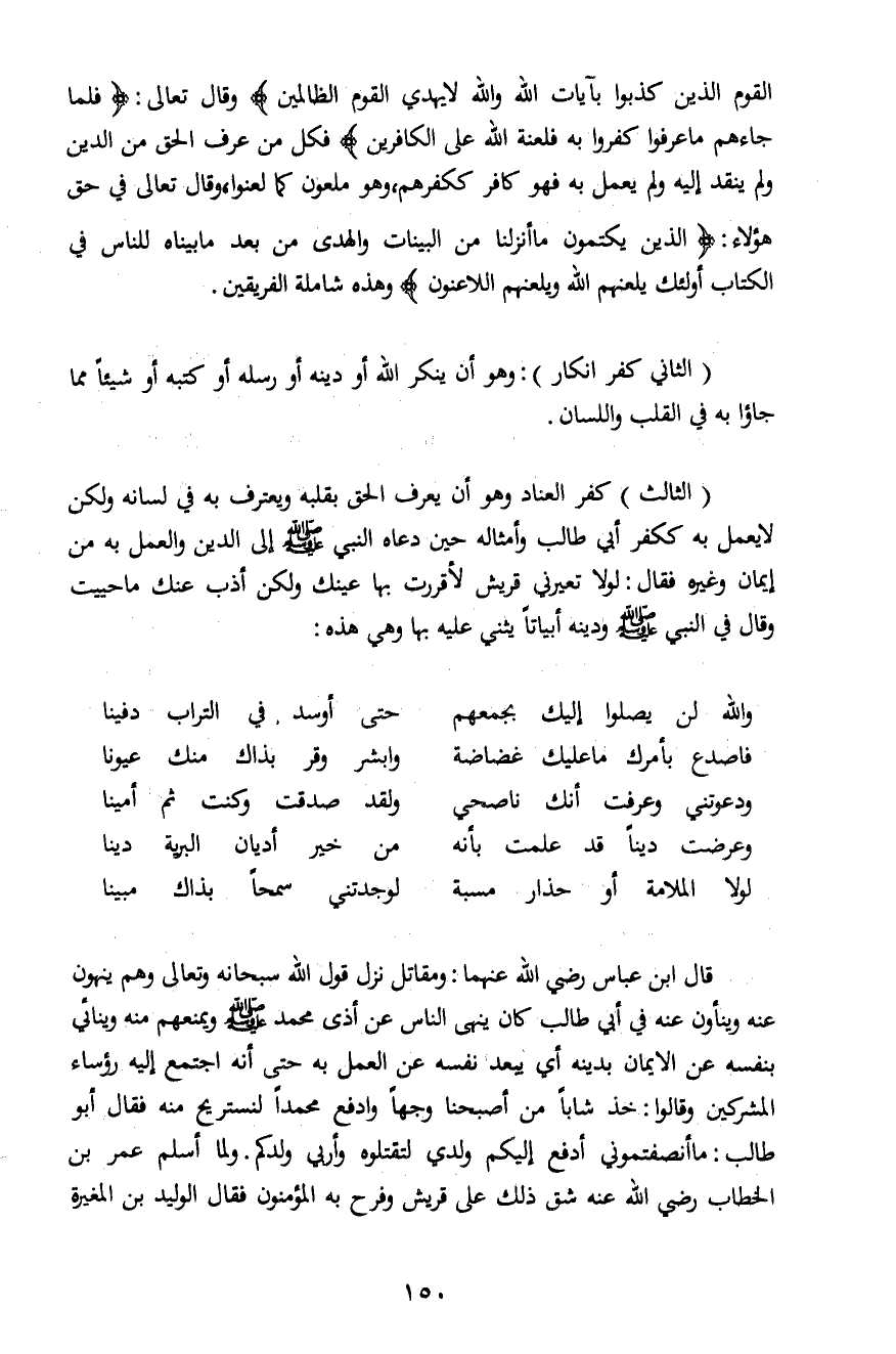 (الثالث) كفر العناد وهو أن يعرف الحق بقلبه ويعترف به في لسانه ولكن لا يعمل به ككفر أبي طالب وأمثاله حين دعاه النبي صلى الله عليه وسلم إلى الدين والعمل به من إيمان وغيره فقال: لولا تعيرني قريش لأقررت بها عينك ولكن أذب عنك ما حييت وقال في النبي صلى الله عليه وسلم ودينه أبياتاً يثني عليه بها وهي هذه: