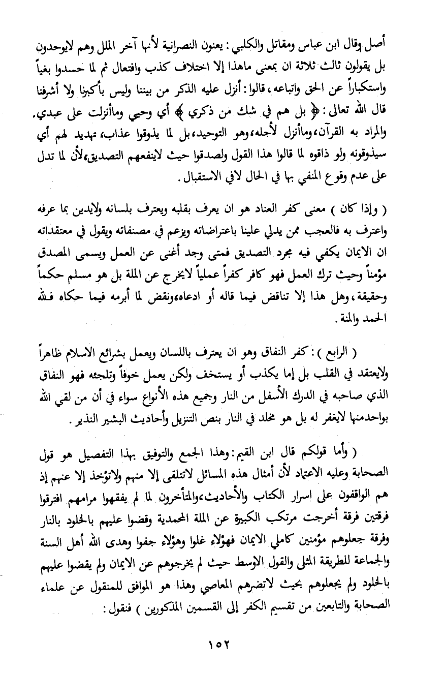 (الرابع) : كفر النفاق وهو ان يعترف باللسان ويعمل بشرائع الإسلام ظاهراً ولا يعتقد في القلب بل إما يكذب أو يستخف ولكن يعمل خوفاً وتلجئه فهو النفاق الذي صاحبه في الدرك الأسفل من النار وجميع هذه الأنواع سواء في أن من لقي الله بواحد منها لا يغفر له بل هو مخلد في النار بنص التنزيل وأحاديث البشير النذير.