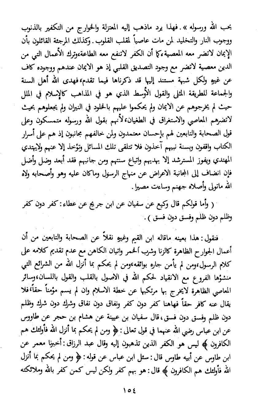 فنقول: هذا بعينه ما قاله ابن القيم وغيره نقلاً عن الصحابة والتابعين من أن أعمال الجوارح الظاهرة كالزنا وشرب الخمر وإتيان الكاهن مع عدم تقديم كلامه على كلام الرسول، ومن لم يأمن جاره بوائقه، ومن لم يحكم بما أنزل الله من الشرائع التي منشؤها الفروع مع الانقياد لحكم الله في الأصول بالقلب والقول باللسان، وسائر المعاصي الظاهرة لا يخرج بها مرتكبها عن خطة الإسلام وان لم يسم مؤمناً حقاً، فلا يقال عنه كافر حقاً فهاهنا كفر درن كفر ونفاق دون نفاق وشرك دون شرك وظلم دون ظلم وفسق دون فسق، قال سفيان بن عيينة عن هشام بن حجر عن طاووس عن ابن عباس رضي الله عنهما في قول تعالى: {وَمَنْ لَمْ يَحْكُمْ بِمَا أَنْزَلَ اللَّهُ فَأُولَئِكَ هُمُ الْكَافِرُونَ} ليس هو الكفر الذين تذهبون إليه وقال عبد الرزاق: أخبرنا معمر عن ابن طاووس عن أبيه طاووس قال: سئل ابن عباس عن قوله: {وَمَنْ لَمْ يَحْكُمْ بِمَا أَنْزَلَ اللَّهُ فَأُولَئِكَ هُمُ الْكَافِرُونَ} قال: هو بهم كفر ولكن ليس كمن كفر بالله وملائكته