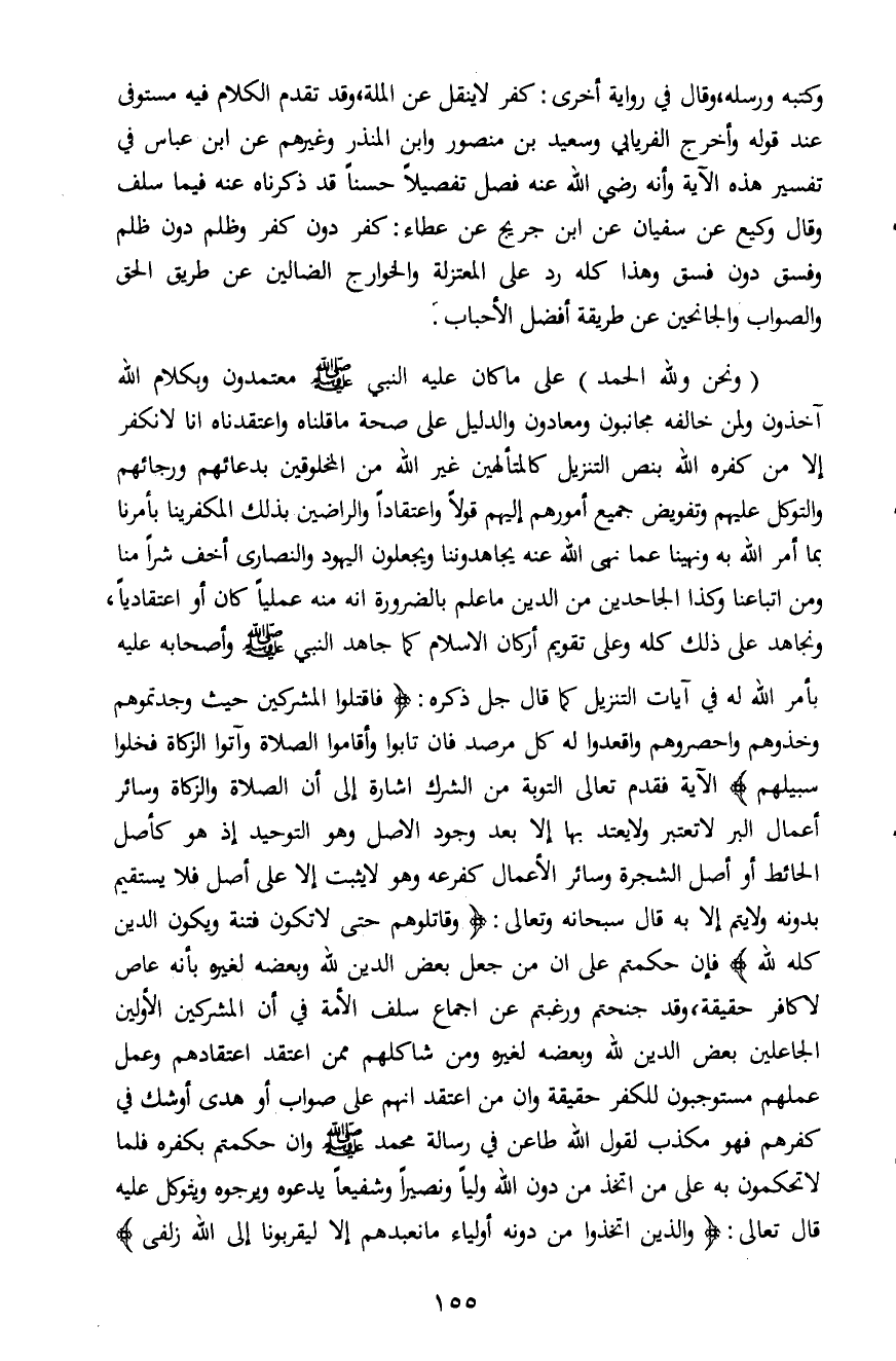 (ونحن ولله الحمد) على ما كان عليه النبي صلى الله عليه وسلم معتمدون وبكلام الله آخذون ولمن خالفه مجانبون ومعادون والدليل على صحة ما قلناه واعتقدناه إنا لا نكفر إلا من كفره الله بنص التنزيل كالمتألهين غير الله من المخلوقين بدعائهم ورجائهم والتوكل عليهم وتفويض جميع أمورهم إليهم قولاً واعتقاداً والراضين بذلك المكفرينا بأمرنا بما أمر الله به ونهينا عما نهى الله عنه يجاهدوننا ويجعلون اليهود والنصارى أخف شراً منا ومن إتباعنا وكذا الجاحدين من الدين ما علم بالضرورة انه منه عملياً كان أو اعتقادياً، ونجاهد على ذلك كله وعلى تقويم أركان الإسلام كما جاهد النبي صلى الله عليه وسلم وأصحابه عليه بأمر الله له في آيات التنزيل كما قال جل ذكره: {فَاقْتُلُوا الْمُشْرِكِينَ حَيْثُ وَجَدْتُمُوهُمْ وَخُذُوهُمْ وَاحْصُرُوهُمْ وَاقْعُدُوا لَهُمْ كُلَّ مَرْصَدٍ فَإِنْ تَابُوا وَأَقَامُوا الصَّلاةَ وَآتَوُا الزَّكَاةَ فَخَلُّوا سَبِيلَهُمْ} الآية فقدم تعالى التوبة من الشرك إشارة إلى أن الصلاة والزكاة وسائر أعمال البر لا تعتبر ولا يعتد بها إلا بعد وجود الأصل وهو التوحيد إذ هو كأصل الحائط أو أصل الشجرة وسائر الأعمال كفرعه وهو لا يثبت إلا على أصل فلا يستقيم بدونه ولا يتم إلا به قال سبحانه وتعالى: {وَقَاتِلُوهُمْ حَتَّى لا تَكُونَ فِتْنَةٌ وَيَكُونَ الدِّينُ كُلُّهُ لِلَّهِ} فإن حكمتم على ان من جعل بعض الدين لله وبعضه لغيره بأنه عاص لا كافر حقيقة، وقد جنحتم وكيع عن إجماع سلف الأمة في أن المشركين الأولين الجاعلين بعض الدين لله وبعضه لغيره ومن شاكلهم ممن اعتقد اعتقادهم وعمل عملهم مستوجبون للكفر حقيقة وان من اعتقد انهم على صواب أو هدى أو شك في كفرهم فهو مكذب لقول الله طاعن في رسالة محمد صلى الله عليه وسلم وان حكمتم بكفره فلما لا تحكمون به على من اتخذ من دون الله ولياً ونصيراً وشفيعاً يدعوه ويرجوه ويتوكل عليه قال تعالى: {وَالَّذِينَ اتَّخَذُوا مِنْ دُونِهِ أَوْلِيَاءَ مَا نَعْبُدُهُمْ إِلَّا لِيُقَرِّبُونَا إِلَى اللَّهِ زُلْفَى}