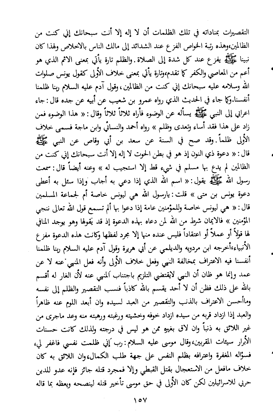 التقصيرات بمناداته في تلك الظلمات أن لا إله إلا أنت سبحانك إني كنت من الظالمين، وهذه رتبة الخواص الفزع عند الشدائد إلى مالك الناس بالإخلاص ولهذا كان نبينا صلى الله عليه وسلم يفزع عند كل شدة إلى الصلاة. والظلم تارة يأتي بمعنى الإثم الذي هو أعم من المعاصي والكفر كما تقدم، وتارة يأتي بمعنى خلاف الأولى كقول يونس صلوات الله وسلامه عليه سبحانك إني كنت من الظالمين، وقول آدم عليه السلام ربنا ظلمنا أنفسنا. وكما جاء في الحديث الذي رواه عمرو بن شعيب عن أبيه عن جده قال: جاء إعرابي إلى النبي صلى الله عليه وسلم يسأله عن الوضوء فأراه ثلاثاً ثلاثاً وقال: "هذا الوضوء فمن زاد على هذا فقد أساء وتعدى وظلم" رواه أحمد والنسائي وابن ماجة فسمى خلاف الأولى ظلماً. وقد صح في السنة عن سعد بن أبي وقاص عن النبي صلى الله عليه وسلم قال: " دعوة ذي النون إذ هو في بطن الحوت لا إله إلا أنت سبحانك إني كنت من الظالمين لم يدع بها مسلم في شيء قط إلا استجيب له" وعنه أيضاً قال: سمعت رسول الله صلى الله عليه وسلم يقول: " اسم الله الذي إذا دعي به أجاب. وإذا سئل به أعطى دعوة يونس بن متى" قلت: يا رسول الله هي ليونس خاصة أم لجماعة المسلمين قال: "هي ليونس خاصة وللمؤمنين عامة إذا دعوا بها ألم تسمع قول الله تعالى ننجي المؤمنين" فالإيمان شرط من الله لمن دعاه بهذه الدعوة إذ قد يقولها وهو يوجد المنافي لها قولاً أو عملاً أو اعتقاداً فليس عنده منها إلا مجرد لفظها وكانت هذه الدعوة مفزع الأنبياء، أخرجه ابن مردويه والديلمي عن أبي هريرة وقول آدم عليه السلام ربنا ظلمنا أنفسنا فيه الاعتراف بمخالفة النهي وفعل خلاف الأولى وأنه فعل المنهي عنه لا عن عمد وإنما هو ظان أن النهي لا يقتضي التلزيم باجتناب المنهي عنه لأن الغار له أقسم بالله على ذلك فظن أن لا أحد يقسم بالله كاذباً فنسب التقصير والظلم إلى نفسه وما أحسن الاعتراف بالذنب والتقصير من العبد لسيده وان أبعد اللوم عنه ظاهراً والعبد إذا ازداد قربه من سيده ازداد خوفه وخشيته ورغبته ورهبته منه وعد ما جرى من غير اللائق به ذنباً وان لاق بغيره ممن هو ليس في درجته ولذلك كانت حسنات الأبرار سيئات المقربين، وقال موسى عليه السلام: رب إني ظلمت نفسي فاغفر لي، فسؤاله المغفرة واعترافه بظلم النفس على جهة طلب الكمال، وان اللائق به كان خلاف ما فعل من الاستعجال بقتل القبطي وإلا فمجرد قتله جائز فإنه عدو للدين حربي للاسرائيلين لكن كان الأولى في حق موسى تأخر قتله لينصحه ويعظه بما قاله
