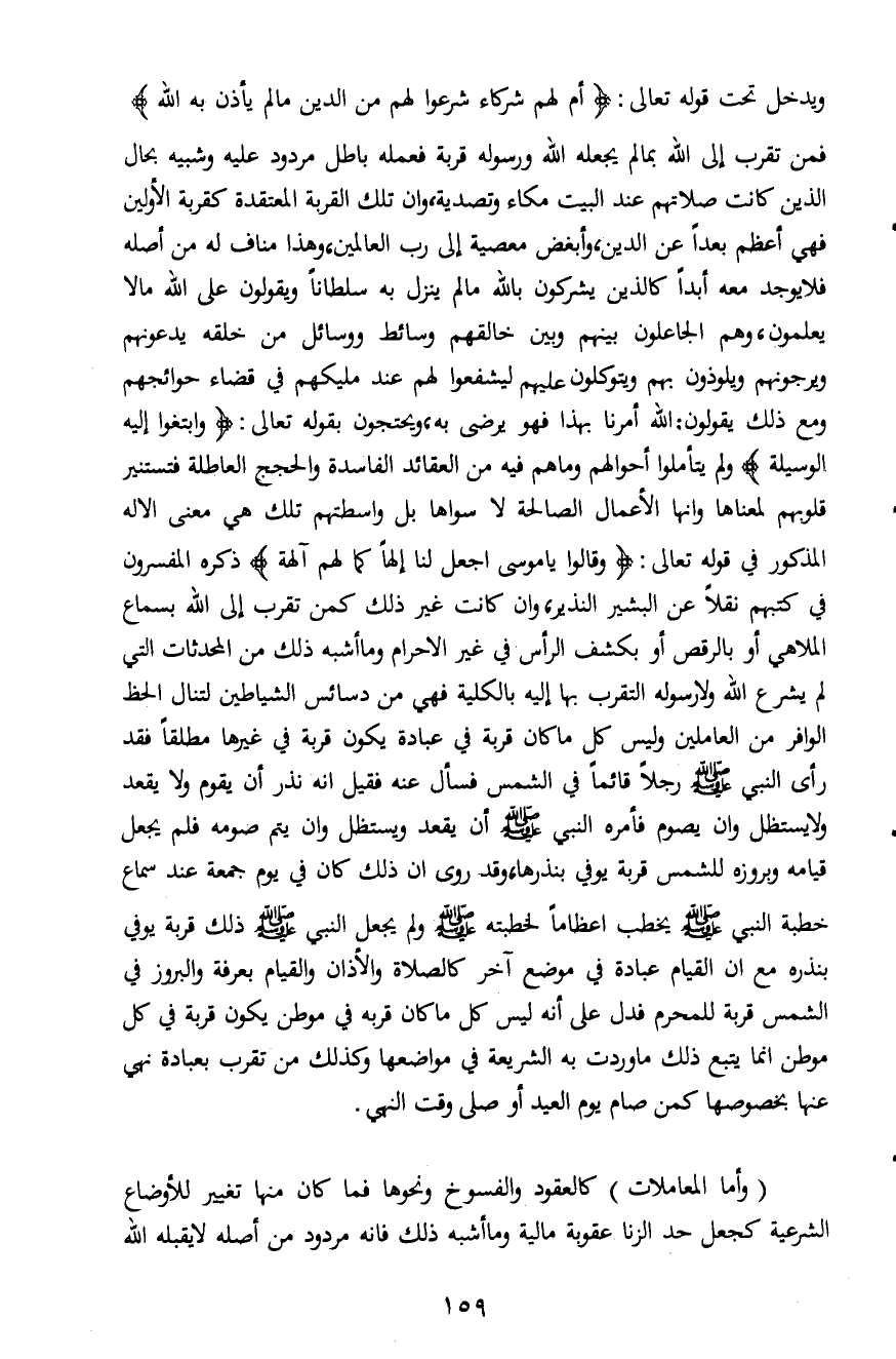ويدخل تحت قوله تعالى: {أَمْ لَهُمْ شُرَكَاءُ شَرَعُوا لَهُمْ مِنَ الدِّينِ مَا لَمْ يَأْذَنْ بِهِ اللَّهُ} فمن تقرب إلى الله بما لم يجعله الله ورسوله قربة فعمله باطل مردود عليه وشبيه بحال الذين كانت صلاتهم عند البيت مكاء وتصدية، وان تلك القربة المعتقدة كقربة الأولين فهي أعظم بعداً عن الدين، وأبغض معصية إلى رب العالمين، وهذا مناف له من أصله فلا يوجد معه أبداً كالذين يشركون بالله ما لم ينزل به سلطاناً ويقولون على الله ما لا يعلمون، وهم الجاعلون بينهم وبين خالقهم وسائط ووسائل من خلقه يدعونهم ويرجونهم ويلوذون بهم ويتوكلون عليهم ليشفعوا لهم عند مليكهم في قضاء حوائجهم ومع ذلك يقولون: الله أمرنا بهذا فهو يرضى به، ويحتجون بقوله تعالى: {وَابْتَغُوا إِلَيْهِ الْوَسِيلَةَ} ولم يتأملوا أحوالهم وما هم فيه من العقائد الفاسدة والحجج العاطلة فتستنير قلوبهم لمعناها وإنها الأعمال الصالحة لا سواها بل واسطتهم تلك هي معنى الإله المذكور في قوله تعالى: {قَالُوا يَا مُوسَى اجْعَلْ لَنَا إِلَهاً كَمَا لَهُمْ آلِهَةٌ} ذكره المفسرون في كتبهم نقلاً عن البشير النذير، وان كانت غير ذلك كمن تقرب إلى الله بسماع الملاهي أو بالرقص أو بكشف الرأس في غير الإحرام وما أشبه ذلك من المحدثات التي لم يشرع الله ولا رسوله التقرب بها إليه بالكلية فهي من دسائس الشياطين لتنال الحظ الوافر من العاملين وليس كل ما كان قربة في عبادة يكون قربة في غيرها مطلقاً فقد رأى النبي صلى الله عليه وسلم رجلاً قائماً في الشمس فسأل عنه فقيل انه نذر أن يقوم ولا يقعد ولا يستظل وان يصوم فأمره النبي صلى الله عليه وسلم أن يقعد ويستظل وان يتم صومه فلم يجعل قيامه وبروزه للشمس قربة يوفي بنذرها، وقد روى ان ذلك كان في يوم جمعة عند سماع خطبة النبي صلى الله عليه وسلم يخطب اعظاماً لخطبته صلى الله عليه وسلم ولم يجعل النبي صلى الله عليه وسلم ذلك قربة يوفي بنذره مع ان القيام عبادة في موضع آخر كالصلاة والأذان والقيام بعرفة والبروز في الشمس قربة للمحرم فدل على أنه ليس كل ما كان قربه في موطن يكون قربة في كل موطن إنما يتبع ذلك ما وردت به الشريعة في مواضعها وكذلك من تقرب بعبادة نهي عنها بخصوصها كمن صام يوم العيد أو صلى وقت النهي.