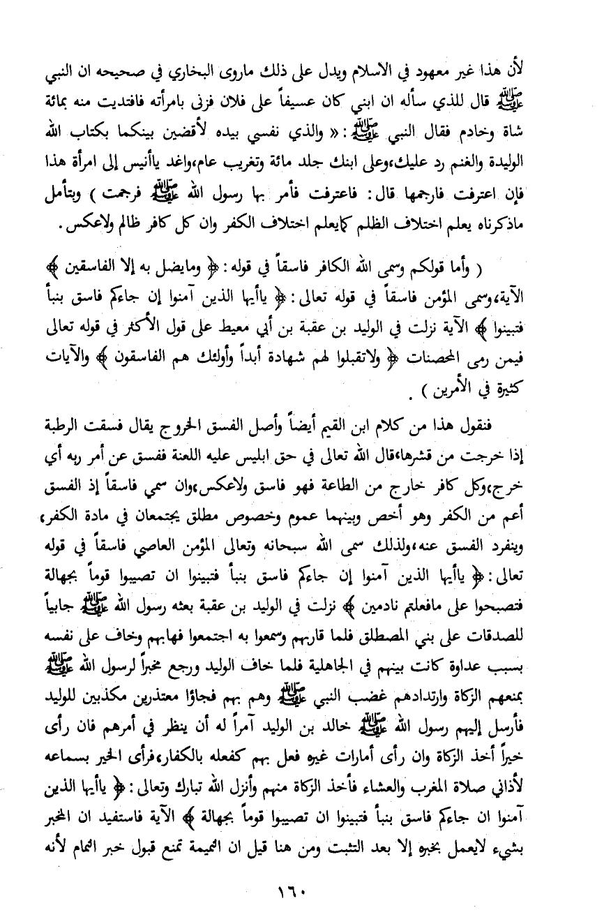 فنقول هذا من كلام ابن القيم أيضاً وأصل الفسق الخروج يقال فسقت الرطبة إذا خرجت من قشرها، قال الله تعالى في حق إبليس عليه اللعنة ففسق عن أمر ربه أي خرج، وكل كافر خارج من الطاعة فهو فاسق ولا عكس، وان سمي فاسقاً إذ الفسق أعم من الكفر وهو أخص وبينهما عموم وخصوص مطلق يجتمعان في مادة الكفر، وينفرد الفسق عنه، ولذلك سمى الله سبحانه وتعالى المؤمن العاصي فاسقاً في قوله تعالى: {يَا أَيُّهَا الَّذِينَ آمَنُوا إِنْ جَاءَكُمْ فَاسِقٌ بِنَبَأٍ فَتَبَيَّنُوا أَنْ تُصِيبُوا قَوْماً بِجَهَالَةٍ فَتُصْبِحُوا عَلَى مَا فَعَلْتُمْ نَادِمِينَ} نزلت في الوليد بن عقبة بعثه رسول الله صلى الله عليه وسلم جابياً للصدقات على بني المصطلق فلما قاربهم وسمعوا به اجتمعوا فهابهم وخاف على نفسه بسبب عداوة كانت بينهم في الجاهلية فلما خاف الوليد ورجع مخبراً لرسول الله صلى الله عليه وسلم بمنعهم الزكاة وارتدادهم غضب النبي صلى الله عليه وسلم وهم بهم فجاؤا معتذرين مكذبين للوليد فأرسل إليهم رسول الله صلى الله عليه وسلم خالد بن الوليد آمراً له أن ينظر في أمرهم فان رأى خيراً أخذ الزكاة وان رأى أمارات غيره فعل بهم كفعله بالكفار، فرأى الخير بسماعه لأذاني صلاة المغرب والعشاء فأخذ الزكاة منهم وأنزل الله تبارك وتعالى: {يَا أَيُّهَا الَّذِينَ آمَنُوا إِنْ جَاءَكُمْ فَاسِقٌ بِنَبَأٍ فَتَبَيَّنُوا أَنْ تُصِيبُوا قَوْماً بِجَهَالَةٍ} الآية فاستفيد ان المخبر بشيء لا يعمل بخبره إلا بعد التثبت ومن هنا قيل ان النميمة تمنع قبول خبر النمام لأنه