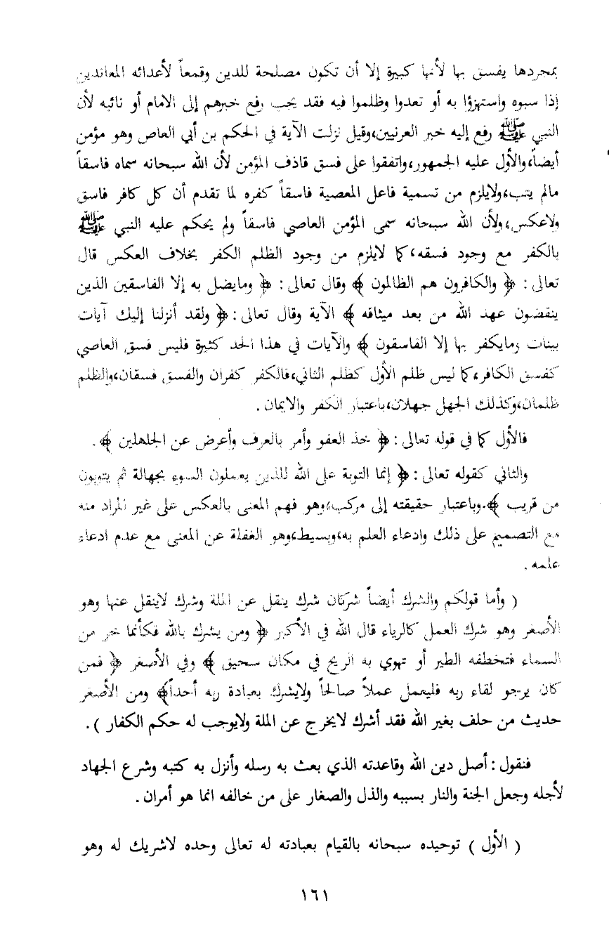 بمجردها يفسق بها لأنها كبيرة إلا أن تكون مصلحة للدين وقمعاً لأعدائه المعاندين إذا سبوه واستهزؤا به أو تعدوا وظلموا فيه فقد يجب رفع خبرهم إلى الإمام أو نائبه لأن النبي صلى الله عليه وسلم رفع إليه خبر العرنيين، وقيل نزلت الآية في الحكم بن أبي العاص وهو مؤمن أيضاً، والأول عليه الجمهور، واتفقوا على فسق قاذف المؤمن لأن الله سبحانه سماه فاسقاً ما لم يتب، ولا يلزم من تسمية فاعل المعصية فاسقاً كفره لما تقدم أن كل كافر فاسق ولا عكس، ولأن الله سبحانه سمى المؤمن العاصي فاسقاً ولم يحكم عليه النبي صلى الله عليه وسلم بالكفر مع وجود فسقه، كما لا يلزم من وجود الظلم الكفر بخلاف العكس قال تعالى: {وَالْكَافِرُونَ هُمُ الظَّالِمُونَ} وقال تعالى: {وَمَا يُضِلُّ بِهِ إِلَّا الْفَاسِقِينَ الَّذِينَ يَنْقُضُونَ عَهْدَ اللَّهِ مِنْ بَعْدِ مِيثَاقِهِ} الآية وقال تعالى: {وَلَقَدْ أَنْزَلْنَا إِلَيْكَ آيَاتٍ بَيِّنَاتٍ وَمَا يَكْفُرُ بِهَا إِلَّا الْفَاسِقُونَ} والآيات في هذا الحد كثيرة فليس فسق العاصي كفسق الكافر، كما ليس ظلم الأول كظلم الثاني، فالكفر كفران والفسق فسقان، والظلم ظلمان، وكذلك الجهل جهلان، باعتبار الكفر والإيمان.