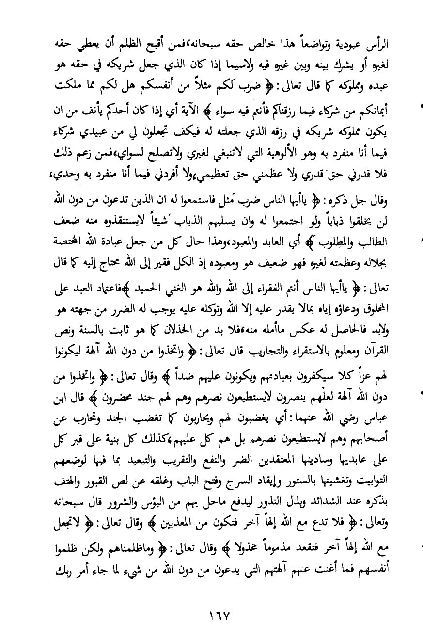 الرأس عبودية وتواضعاً هذا خالص حقه سبحانه، فمن أقبح الظلم أن يعطي حقه لغيره أو يشرك بينه وبين غيره فيه ولاسيما إذا كان الذي جعل شريكه في حقه هو عبده ومملوكه كما قال تعالى: {ضَرَبَ لَكُمْ مَثَلاً مِنْ أَنْفُسِكُمْ هَلْ لَكُمْ مِنْ مَا مَلَكَتْ أَيْمَانُكُمْ مِنْ شُرَكَاءَ فِي مَا رَزَقْنَاكُمْ فَأَنْتُمْ فِيهِ سَوَاءٌ} الآية أي إذا كان أحدكم يأنف من ان يكون مملوكه شريكه في رزقه الذي جعلته له فيكف تجعلون لي من عبيدي شركاء فيما أنا منفرد به وهو الألوهية التي لا تنبغي لغيري ولا تصلح لسواي، فمن زعم ذلك فلا قدرني حق قدري ولا عظمني حق تعظيمي، ولا أفردني فيما أنا منفرد به وحدي، وقال جل ذكره: {يَا أَيُّهَا النَّاسُ ضُرِبَ مَثَلٌ فَاسْتَمِعُوا لَهُ إِنَّ الَّذِينَ تَدْعُونَ مِنْ دُونِ اللَّهِ لَنْ يَخْلُقُوا ذُبَاباً وَلَوِ اجْتَمَعُوا لَهُ وَإِنْ يَسْلُبْهُمُ الذُّبَابُ شَيْئاً لا يَسْتَنْقِذُوهُ مِنْهُ ضَعُفَ الطَّالِبُ وَالْمَطْلُوبُ} أي العابد والمعبود، وهذا حال كل من جعل عبادة الله المختصة بجلاله وعظمته لغيره فهو ضعيف هو ومعبوده إذ الكل فقير إلى الله محتاج إليه كما قال تعالى: {يَا أَيُّهَا النَّاسُ أَنْتُمُ الْفُقَرَاءُ إِلَى اللَّهِ وَاللَّهُ هُوَ الْغَنِيُّ الْحَمِيدُ} فاعتماد العبد على المخلوق ودعاؤه إياه بما لا يقدر عليه إلا الله وتوكله عليه يوجب له الضرر من جهته هو ولا بد فالحاصل له عكس ما أمله منه، فلا بد من الخذلان كما هو ثابت بالسنة ونص القرآن ومعلوم بالاستقراء والتجاريب قال تعالى: {وَاتَّخَذُوا مِنْ دُونِ اللَّهِ آلِهَةً لِيَكُونُوا لَهُمْ عِزّاً * كَلاَّ سَيَكْفُرُونَ بِعِبَادَتِهِمْ وَيَكُونُونَ عَلَيْهِمْ ضِدّاً} وقال تعالى: {وَاتَّخَذُوا مِنْ دُونِ اللَّهِ آلِهَةً لَعَلَّهُمْ يُنْصَرُونَ * لا يَسْتَطِيعُونَ نَصْرَهُمْ وَهُمْ لَهُمْ جُنْدٌ مُحْضَرُونَ} قال ابن عباس رضي الله عنهما: أي يغضبون لهم ويحاربون كما تغضب الجند وتحارب عن أصحابهم وهم لا يستطيعون نصرهم بل هم كل عليهم، كذلك كل بنية على قبر كل على عابديها وسادينها المعتقدين الضر والنفع والتقريب والتبعيد بما فيها لوضعهم التوابيت وتغشيتها بالستور وإيقاد السرج وفتح الباب وغلقه عن لص القبور والهتف بذكره عند الشدائد وبذل النذور ليدفع ما حل بهم من البؤس والشرور قال سبحانه وتعالى: {فَلا تَدْعُ مَعَ اللَّهِ إِلَهاً آخَرَ فَتَكُونَ مِنَ الْمُعَذَّبِينَ} وقال تعالى: {لا تَجْعَلْ مَعَ اللَّهِ إِلَهاً آخَرَ فَتَقْعُدَ مَذْمُوماً مَخْذُولاً} وقال تعالى: {وَمَا ظَلَمْنَاهُمْ وَلَكِنْ ظَلَمُوا أَنْفُسَهُمْ فَمَا أَغْنَتْ عَنْهُمْ آلِهَتُهُمُ الَّتِي يَدْعُونَ مِنْ دُونِ اللَّهِ مِنْ شَيْءٍ لَمَّا جَاءَ أَمْرُ رَبِّكَ