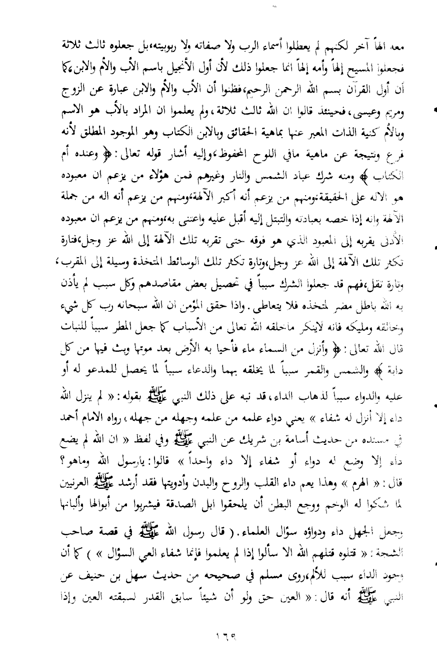 معه إلهاً آخر لكنهم لم يعطلوا أسماء الرب ولا صفاته ولا ربوبيته، بل جعلوه ثالث ثلاثة فجعلوا المسيح إلهاً وأمه إلهاً إنما جعلوا ذلك لأن أول الإنجيل باسم الأب والأم والابن، كما أن أول القرآن بسم الله الرحمن الرحيم، فظنوا أن الأب والأم والابن عبارة عن الزوج ومريم وعيسى، فحينئذ قالوا ان الله ثالث ثلاثة، ولم يعلموا ان المراد بالأب هو الاسم وبالأم كنية الذات المعبر عنها بماهية الحقائق وبالابن الكتاب وهو الموجود المطلق لأنه فرع ونتيجة عن ماهية ما في اللوح المحفوظ، واليه أشار قوله تعالى: {وَعِنْدَهُ أُمُّ الْكِتَابِ} ومنه شرك عباد الشمس والنار وغيرهم فمن هؤلاء من يزعم ان معبوده هو الإله على الحقيقة، ومنهم من يزعم أنه أكبر الآلهة، ومنهم من يزعم أنه إله من جملة الآلهة وانه إذا خصه بعبادته والتبتل إليه أقبل عليه واعتنى به، ومنهم من يزعم ان معبوده الأدنى يقربه إلى المعبود الذي هو فوقه حتى تقربه تلك الآلهة إلى الله عز وجل، فتارة تكثر تلك الآلهة إلى الله عز وجل، وتارة تكثر تلك الوسائط المتخذة وسيلة إلى المقرب، وتارة تقل، فهم قد جعلوا الشرك سبباً في تحصيل بعض مقاصدهم وكل سبب لم يأذن به الله باطل مضر لمتخذه فلا يتعاطى. وإذا حقق المؤمن ان الله سبحانه رب كل شيء وخالقه ومليكه فانه لا ينكر ما خلقه الله تعالى من الأسباب كما جعل المطر سبباً للنبات قال الله تعالى: {وَمَا أَنْزَلَ اللَّهُ مِنَ السَّمَاءِ مِنْ مَاءٍ فَأَحْيَا بِهِ الْأَرْضَ بَعْدَ مَوْتِهَا وَبَثَّ فِيهَا مِنْ كُلِّ دَابَّةٍ} والشمس والقمر سبباً لما بخلقه بهما والدعاء سبباً لما يحصل للمدعو له أو عليه والدواء سبباً لذهاب الداء، قد نبه على ذلك النبي صلى الله عليه وسلم بقوله: "لم ينزل الله داء الا أنزل له شفاء" يعني دواء علمه من علمه وجهله من جهله"، رواه الإمام أحمد في مسنده من حديث أسامة بن شريك عن النبي صلى الله عليه وسلم وفي لفظ " ان الله لم يضع داء إلا وضع له دواء أو شفاء إلا داء واحداً" قالوا: يا رسول الله وما هو؟ قال: " الهرم" وهذا يعم داء القلب والروح والبدن وأدويتها فقد أرشد صلى الله عليه وسلم العرنيين لما شكوا له الوخم ووجع البطن أن يلحقوا ابل الصدقة فيشربوا من أبوالها وألبانها وجعل الجهل داء ودواؤه سؤال العلماء. (قال رسول الله صلى الله عليه وسلم في قصة صاحب الشجة: "قتلوه قتلهم الله الا سألوا إذا لم يعلموا فإنما شفاء العي السؤال") كما أن وجود الداء سبب للألم، روى مسلم في صحيحه من حديث سهل بن حنيف عن النبي صلى الله عليه وسلم أنه قال: "العين حق ولو أن شيئاً سابق القدر لسبقته العين وإذا