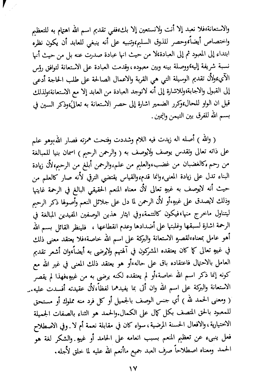 (والله) أصله اله زيدت فيه اللام وشددت وفتحت همزته فصار الله؛ وهو علم على ذاته تعالى وتقدس يوصف ولا يوصف به (والرحمن الرحيم) اسمان بنيا للمبالغة من رحم، كالغضبان من غضب، والعليم من علم، والرحمن أبلغ من الرحيم، لأن زيادة البناء تدل على زيادة المعنى، وإنما قدم، والقياس يقتضى الترقي لأنه صار كالعلم من حيث أنه لا يوصف به غيره تعالى لأن معناه المنعم الحقيقي البالغ في الرحمة غايتها وذلك لا يصدق على غيره، أو لأن الرحمن لما دل على جلائل النعم وأصولها ذكر الرحيم ليتناول ما خرج منها، فيكون كالتتمة، وفي إيثار هذين الوصفين المفيدين المبالغة في الرحمة إشارة لسبقها وغلبتها على أضدادها وعدم انقطاعها، فلينظر القائل بسم الله أهو عامل بمعناه، لقصره الاستعانة والبركة على اسم الله خاصة، فلا يعتقد معنى ذلك في غيره تعالى كما كان يعتقده المشركون في آلهتهم ولا يرضى به أيضاً، وان أشعر تقديم العامل بالاحتمال فاعتقاده باق على حاله، أو هو يعتقد ذلك المعنى في غير الله مع كونه إنما ذكر اسم الله خاصة، أو لم يعتقده لكنه يرضى به من غيره، فهذا لم يقصر الاستعانة والبركة على اسم الله وان أتى بما يفيدهما لفظاً، لأن عقيدته أفسدت عليه.