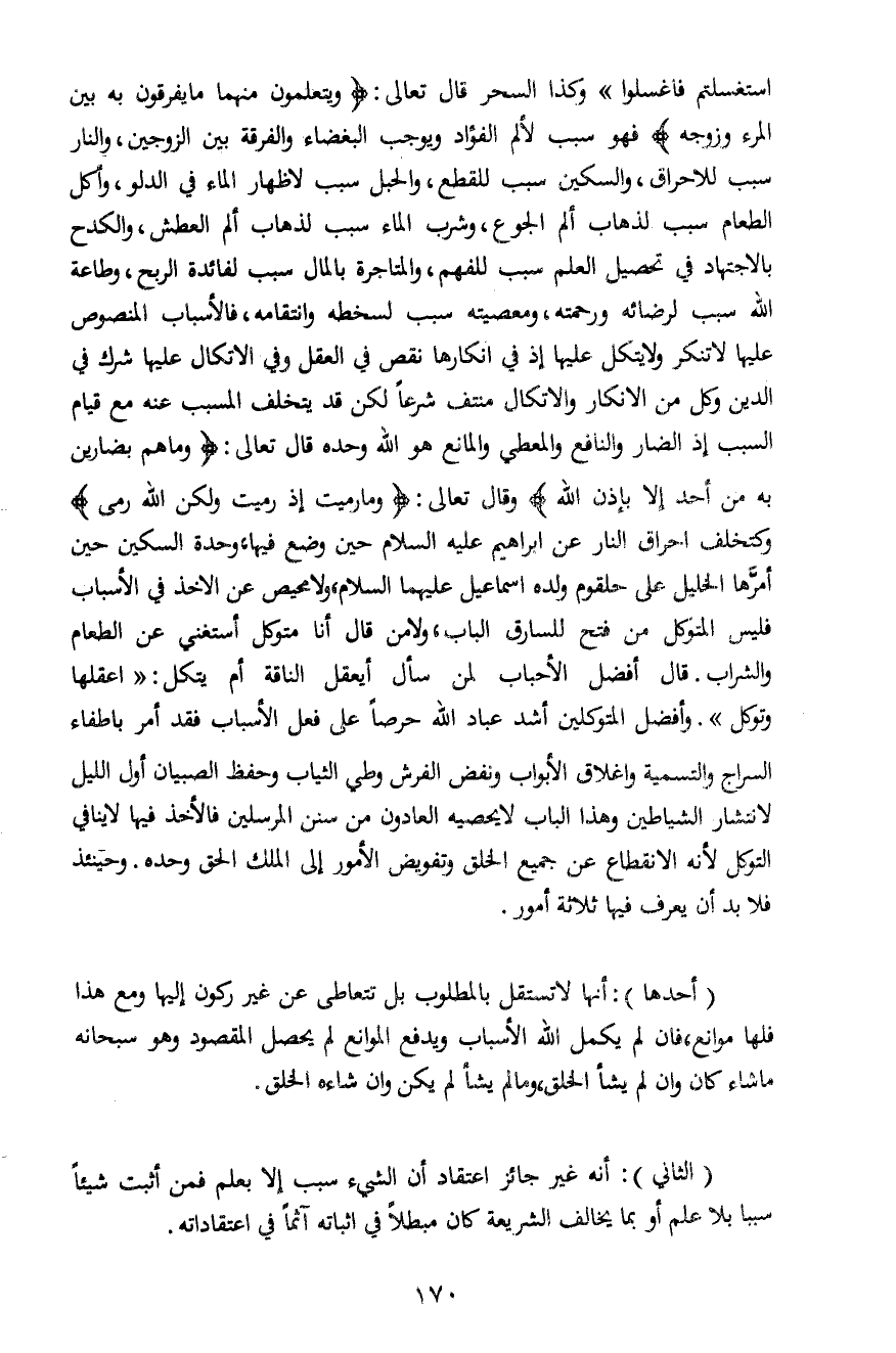 استغسلتم فاغسلوا" وكذا السحر قال تعالى: {فَيَتَعَلَّمُونَ مِنْهُمَا مَا يُفَرِّقُونَ بِهِ بَيْنَ الْمَرْءِ وَزَوْجِه} فهو سبب لألم الفؤاد ويوجب البغضاء والفرقة بين الزوجين، والنار سبب للإحراق، والسكين سبب للقطع، والحبل سبب لإظهار الماء في الدلو، وأكل الطعام سبب لذهاب ألم الجوع، وشرب الماء سبب لذهاب ألم العطش، والكدح بالاجتهاد في تحصيل العلم سبب للفهم، والمتاجرة بالمال سبب لفائدة الربح، وطاعة الله سبب لرضائه ورحمته، ومعصيته سبب لسخطه وانتقامه، فالأسباب المنصوص عليها لا تنكر ولا يتكل عليها إذ في إنكارها نقص في العقل وفي الاتكال عليها شرك في الدين وكل من الإنكار والاتكال منتف شرعاً لكن قد يتخلف المسبب عنه مع قيام السبب إذ الضار والنافع والمعطي والمانع هو الله وحده قال تعالى: {وَمَا هُمْ بِضَارِّينَ بِهِ مِنْ أَحَدٍ إِلَّا بِإِذْنِ اللَّهِ} وقال تعالى: {وَمَا رَمَيْتَ إِذْ رَمَيْتَ وَلَكِنَّ اللَّهَ رَمَى} وكتخلف إحراق النار عن إبراهيم عليه السلام حين وضع فيها، وحدة السكين حين أمرّها الخليل على حلقوم ولده إسماعيل عليهما السلام، ولا محيص عن الأخذ في الأسباب فليس المتوكل من فتح للسارق الباب، ولا من قال أنا متوكل أستغني عن الطعام والشراب. قال أفضل الأحباب لمن سأل أيعقل الناقة أم يتكل: "اعقلها وتوكل". وأفضل المتوكلين أشد عباد الله حرصاً على فعل الأسباب فقد أمر بإطفاء السراج والتسمية وإغلاق الأبواب ونفض الفرش وطي الثياب وحفظ الصبيان أول الليل لانتشار الشياطين وهذا الباب لا يحصيه العادون من سنن المرسلين فالأخذ فيها لا ينافي التوكل لأنه الانقطاع عن جميع الخلق وتفويض الأمور إلى الملك الحق وحده. وحينئذ فلا بد أن يعرف فيها ثلاثة أمور.