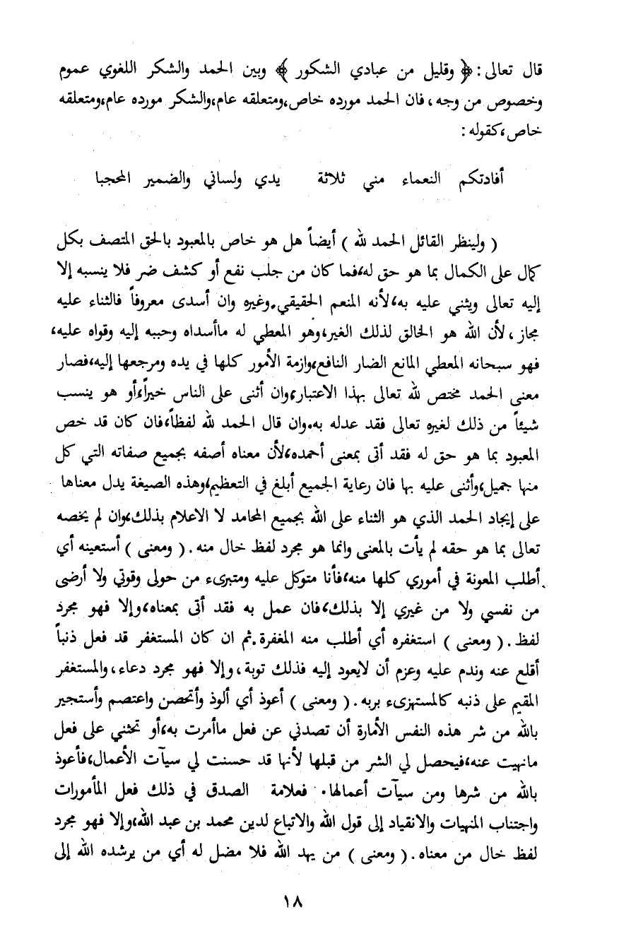 قال تعالى: {وَقَلِيلٌ مِنْ عِبَادِيَ الشَّكُورُ} وبين الحمد والشكر اللغوي عموم وخصوص من وجه، فان الحمد مورده خاص، ومتعلقه عام، والشكر مورده عام، ومتعلقه خاص كقوله: