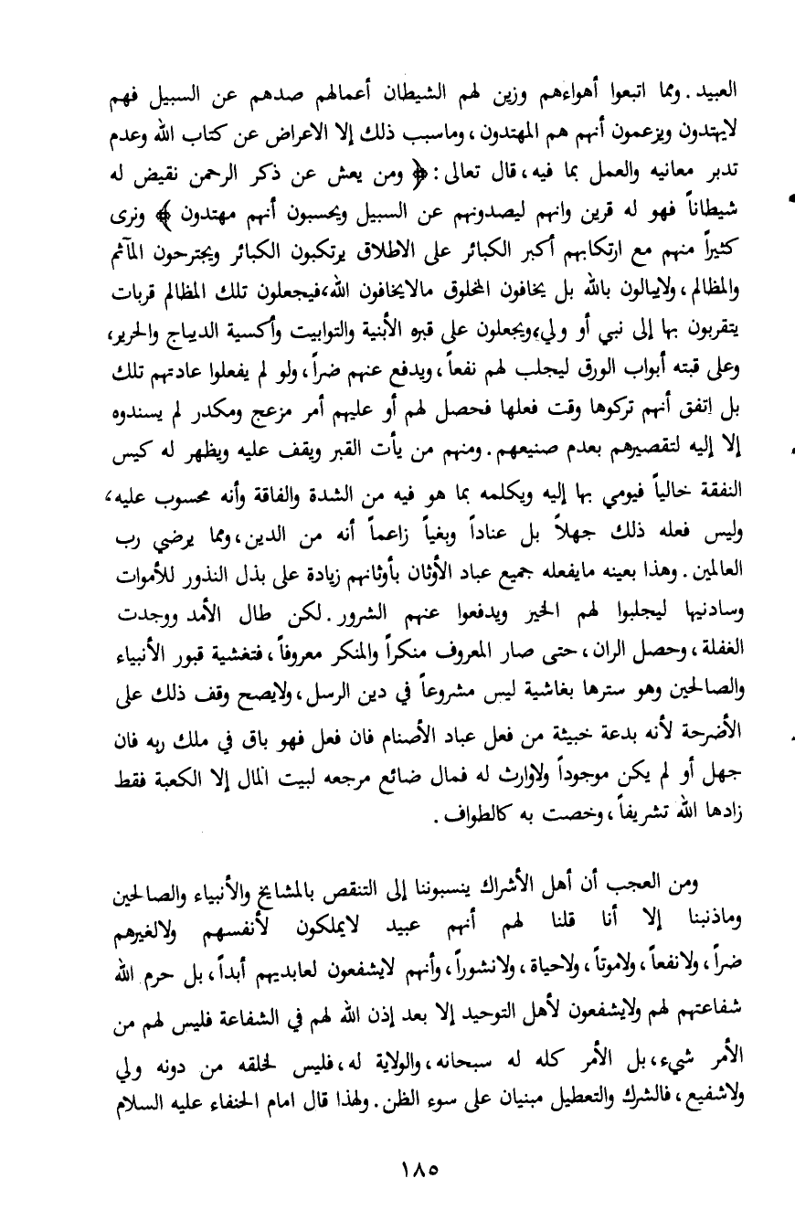 العبيد. ولما اتبعوا أهواءهم وزين لهم الشيطان أعمالهم صدهم عن السبيل فهم لا تهدون ويزعمون أنهم هم المهتدون، وما سبب ذلك إلا الإعراض عن كتاب الله وعدم تدبر معانيه والعمل بما فيه، قال تعالى: {وَمَنْ يَعْشُ عَنْ ذِكْرِ الرَّحْمَنِ نُقَيِّضْ لَهُ شَيْطَاناً فَهُوَ لَهُ قَرِينٌ * وَإِنَّهُمْ لَيَصُدُّونَهُمْ عَنِ السَّبِيلِ وَيَحْسَبُونَ أَنَّهُمْ مُهْتَدُونَ} ونرى كثيراً منهم مع ارتكابهم أكبر الكبائر على الإطلاق يرتكبون الكبائر ويجترحون المآثم والمظالم، ولا يبالون بالله بل يخافون المخلوق ما لا يخافون الله، فيجعلون تلك المظالم قربات يتقربون بها إلى نبي أو ولي، ويجعلون على قبره الأبنية والتوابيت وأكسية الديباج والحرير، وعلى قبته أبواب الورق ليجلب لهم نفعاً، ويدفع عنهم ضراً، ولو لم يفعلوا عادتهم تلك بل اتفق أنهم تركوها وقت فعلها فحصل لهم أو عليهم أمر مزعج ومكدر لم يسندوه إلا إليه لتقصيرهم بعدم صنيعهم. ومنهم من يأت القبر ويقف عليه ويظهر له كيس النفقة خالياً فيومي بها إليه ويكلمه بما هو فيه من الشدة والفاقة وأنه محسوب عليه، وليس فعله ذلك جهلاً بل عناداً وبغياً زاعماً أنه من الدين، ومما يرضي رب العالمين. وهذا بعينه ما يفعله جميع عباد الأوثان بأوثانهم زيادة على بذل النذور للأموات وسادنيها ليجلبوا لهم الخير ويدفعوا عنهم الشرور. لكن طال الأمد ووجدت الغفلة، وحصل الران، حتى صار المعروف منكراً والمنكر معروفاً، فتغشية قبور الأنبياء والصالحين وهو سترها بغاشية ليس مشروعاً في دين الرسل، ولا يصح وقف ذلك على الأضرحة لأنه بدعة خبيثة من فعل عباد الأصنام فان فعل فهو باق في ملك ربه فان جهل أو لم يكن موجوداً ولا وارث له فمال ضائع مرجعه لبيت المال إلا الكعبة فقط زادها الله تشريفاً، وخصت به كالطواف.