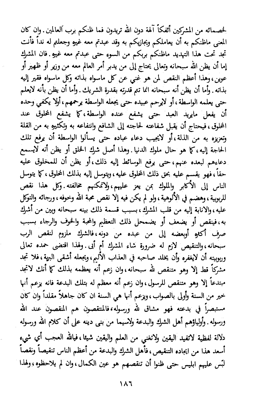 لخصمائه من المشركين أئفكاً آلهة دون الله تريدون فما ظنكم برب لعالمين. وان كان المعنى ما ظنكم به أن يعاملكم ويجازيكم به وقد عبدتم معه غيره وجعلتم له نداً فأنت تجد تحت هذا التهديد ما ظنكم بربكم من السوء حتى عبدتم معه غيره. فان المشرك إما أن يظن الله سبحانه وتعالى يحتاج إلى من يدبر أمر العالم معه من وزير أو ظهير أو عوين، وهذا أعظم النقص لمن هو غني عن كل ما سواه بذاته وكل ما سواه فقير إليه بذاته. وأما أن يظن أنه سبحانه إنما تتم قدرته بقدرة الشريك. وأما أن يظن بأنه لا يعلم حتى يعلمه الواسطة، أو لا يرحم عبيده حتى يجعله الواسطة يرحمهم، أولاً يكفي وحده أن يفعل ما يريد العبد حتى يشفع عنده الواسطة، كما يشفع المخلوق عند المخلوق، فيحتاج أن يقبل شفاعته لحاجته إلى الشافع وانتفاعه به وتكثيره به من القلة وتعزيزه به من الذلة، أو لا يجيب دعاء عباده حتى يسألوا الواسطة أن يرفع تلك الحاجة إليه، كما هو حال ملوك الدنيا. وهذا أصل شرك الخلق أو يظن أنه لا يسمع دعاءهم لبعده عنهم، حتى يرفع الوسائط إليه ذلك، أو يظن أن للمخلوق عليه حقاً، فهو يقسم عليه بحق ذلك المخلوق عليه، ويتوسل إليه بذلك المخلوق، كما يتوسل الناس إلى الأكابر والملوك بمن يعز عليهم، ولا تمكنهم مخالفته. وكل هذا نقص للربوبية، وهضم في الألوهية، ولو لم يكن فيه إلا نقص محبة الله وخوفه، ورجائه والتوكل عليه، والإنابة إليه من قلب المشرك، بسبب قسمة ذلك بينه سبحانه وبين من أشرك به، فينقص أو يضعف أو يضمحل ذلك التعظيم والمحبة والخوف والرجاء بسبب صرف أكثره أو بعضه إلى من عبده من دونه، فالشرك ملزوم لنقص الرب سبحانه، والتنقيص لازم له ضرورة شاء المشرك أم أبى. ولهذا اقتضى حمده تعالى وربوبيته أن لا يغفره وأن يخلد صاحبه في العذاب الأليم، ويجعله أشقى البرية، فلا تجد مشركاً قط إلا وهو متنقص لله سبحانه، وان زعم أنه يعظمه بذلك كما أنك لا تجد مبتدعاً إلا وهو متنقص للرسول، وان زعم أنه معظم له بتلك البدعة فانه يزعم أنها خير من السنة وأولى بالصواب، ويزعم أنها هي السنة ان كان جاهلاً مقلداً وان كان مستبصراً في بدعته فهو مشاق لله ورسوله، فالمنتقصون هم المنقصون عند الله ورسوله. وأولياؤهم أهل الشرك والبدعة ولاسيما من بنى دينه على أن كلام الله ورسوله دلالة لفظية لا تفيد اليقين ولا تغني من العلم واليقين شيئاً، فيالله العجب أي شيء أسعد هذا من إيجاده التنقيص، فأهل الشرك والبدعة من أعظم الناس تنقيصاً ونقصاً لبس عليهم إبليس حتى ظنوا أن تنقصهم هو عين الكمال، وان لم يلاحظوه، ولهذا