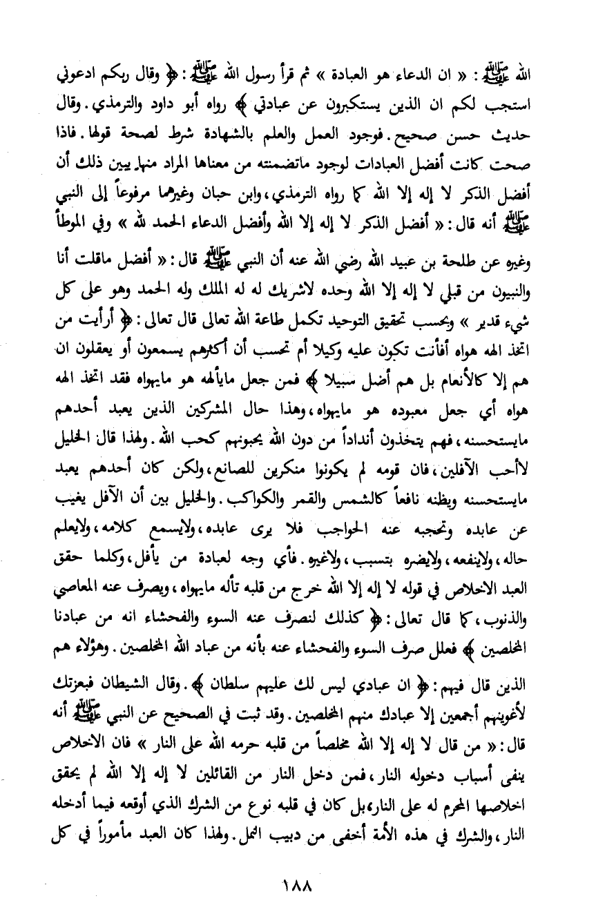 الله صلى الله عليه وسلم: "ان الدعاء هو العبادة" ثم قرأ رسول الله صلى الله عليه وسلم: {وَقَالَ رَبُّكُمُ ادْعُونِي أَسْتَجِبْ لَكُمْ إِنَّ الَّذِينَ يَسْتَكْبِرُونَ عَنْ عِبَادَتِي} رواه أبو داود والترمذي. وقال حديث حسن صحيح. فوجود العمل والعلم بالشهادة شرط لصحة قولها. فإذا صحت كانت أفضل العبادات لوجود ما تضمنته من معناها المراد منها يبين ذلك أن أفضل الذكر لا اله إلا الله كما رواه الترمذي، وابن حبان وغيرهما مرفوعاً إلى النبي صلى الله عليه وسلم أنه قال: " أفضل الذكر لا إله إلا الله وأفضل الدعاء الحمد لله" وفي الموطأ وغيره عن طلحة بن عبيد الله رضي الله عنه أن النبي صلى الله عليه وسلم قال: " أفضل ما قلت أنا والنبيون من قبلي لا إله إلا الله وحده لا شريك له، له الملك وله الحمد وهو على كل شيء قدير " وبحسب تحقيق التوحيد تكمل طاعة الله تعالى قال تعالى: {أَرَأَيْتَ مَنِ اتَّخَذَ إِلَهَهُ هَوَاهُ أَفَأَنْتَ تَكُونُ عَلَيْهِ وَكِيلاً أَمْ تَحْسَبُ أَنَّ أَكْثَرَهُمْ يَسْمَعُونَ أَوْ يَعْقِلُونَ إِنْ هُمْ إِلاَّ كَالأَنْعَامِ بَلْ هُمْ أَضَلُّ سَبِيلاً} فمن جعل ما يألهه هو ما يهواه فقد اتخذ إلهه هواه أي جعل معبوده هو ما يهواه، وهذا حال المشركين الذين يعبد أحدهم ما يستحسنه، فهم يتخذون أنداداً من دون الله يحبونهم كحب الله. ولهذا قال الخليل لا أحب الآفلين، فان قومه لم يكونوا منكرين للصانع، ولكن كان أحدهم يعبد ما يستحسنه ويظنه نافعاً كالشمس والقمر والكواكب. والخليل بين أن الآفل ينيب عن عابده وتحجبه عنه الحواجب فلا يرى عابده، ولا يسمع كلامه، ولا يعلم حاله، ولا ينفعه، ولا يضره بتسبب، ولا غيره. فأي وجه لعبادة من يأفل، كلما حقق العبد الإخلاص في قوله لا اله إلا الله خرج من قلبه تأله ما يهواه، ويصرف عنه المعاصي والذنوب، كما قال تعالى: {كَذَلِكَ لِنَصْرِفَ عَنْهُ السُّوءَ وَالْفَحْشَاءَ إِنَّهُ مِنْ عِبَادِنَا الْمُخْلَصِينَ} فعلل صرف السوء والفحشاء عنه بأنه من عباد الله المخلصين. وهؤلاء هم الذين قال فيهم: {إِنَّ عِبَادِي لَيْسَ لَكَ عَلَيْهِمْ سُلْطَانٌ} . وقال الشيطان فبعزتك لأغوينهم أجمعين إلا عبادك منهم المخلصين. وقد ثبت في الصحيح عن النبي صلى الله عليه وسلم أنه قال: " من قال لا اله إلا الله مخلصاً من قلبه حرمه الله عليه النار" فان الإخلاص ينفي أسباب دخوله النار، فمن دخل النار من القائلين لا اله إلا الله لم يحقق إخلاصها المحرم له على النار، بل كان في قلبه نوع من الشرك الذي أوقعه فيما أدخله النار، والشرك في هذه الأمة أخفى من دبيب النمل. ولهذا كان العبد مأموراً في كل