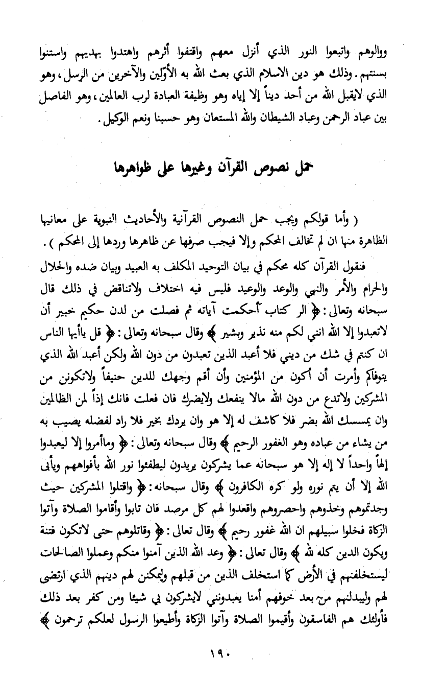 (وأما قولكم ويجب حمل النصوص القرآنية والأحاديث النبوية على معانيها الظاهرة منها ان لم تخالف المحكم وإلا فيجب صرفها عن ظاهرها وردها إلى المحكم) .