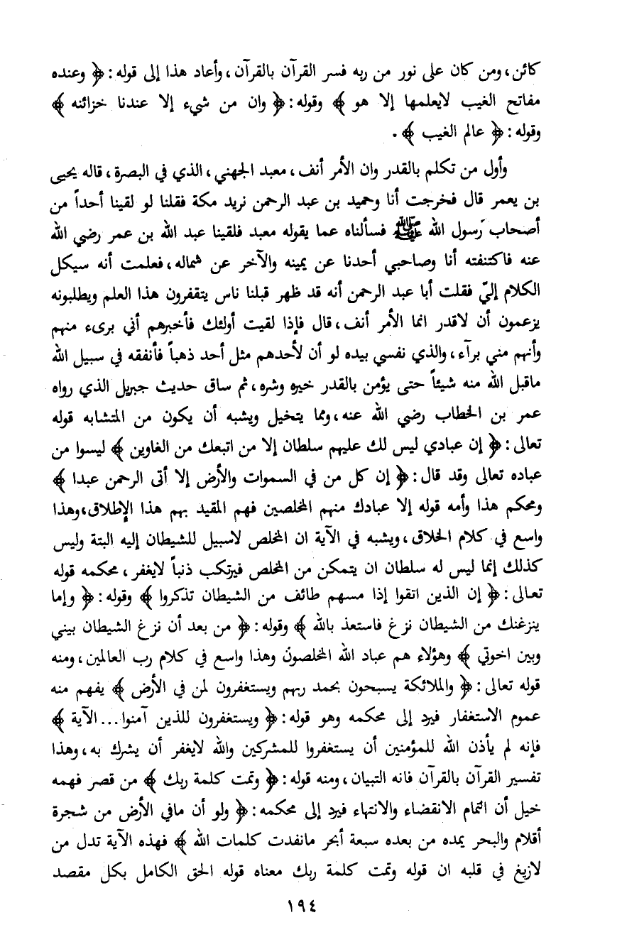 وأول من تكلم بالقدر وان الأمر أنف، معبد الجهني، الذي في البصرة، قاله يحيى بن يعمر قال فخرجت أنا وحميد بن عبد الرحمن نريد مكة فقلنا لو لقينا أحداً من أصحاب رسول الله صلى الله عليه وسلم فسألناه عما يقوله معبد فلقينا عبد الله بن عمر رضي الله عنه فاكتنفته أنا وصاحبي أحدنا عن يمينه والآخر عن شماله، فعلمت أنه سيكل الكلام إليّ فقلت أبا عبد الرحمن أنه قد ظهر قبلنا ناس يتقفرون هذا العلم ويطلبونه يزعمون أن لا قدر انما الأمر أنف، قال فإذا لقيت أولئك فأخبرهم أني بريء منهم وأنهم مني برآء، والذي نفسي بيده لو أن لأحدهم مثل أحد ذهباً فأنفقه في سبيل الله ما قبل الله منه شيئاً حتى يؤمن بالقدر خيره وشره، ثم ساق حديث جبريل الذي رواه عمر بن لخطاب رضي الله عنه، ومما يتخيل ويشبه أن يكون من المتشابه قوله تعالى: {إِنَّ عِبَادِي لَيْسَ لَكَ عَلَيْهِمْ سُلْطَانٌ إِلاَّ مَنِ اتَّبَعَكَ مِنَ الْغَاوِينَ} ليسوا من عباده تعالى وقد قال: {إِنْ كُلُّ مَنْ فِي السَّمَاوَاتِ وَالْأَرْضِ إِلَّا آتِي الرَّحْمَنِ عَبْداً} ومحكم هذا وأمه قوله إلا عبادك منهم المخلصين فهم المقيد بم هذا الإطلاق، وهذا واسع في كلام الخلاق، ويشبه في الآية ان المخلص لا سبيل للشيطان إليه البتة وليس كذلك إنما ليس له سلطان ان يتمكن من المخلص فيرتكب ذنباً لا يغفر، محكمه قوله تعالى: {إِنَّ الَّذِينَ اتَّقَوْا إِذَا مَسَّهُمْ طَائِفٌ مِنَ الشَّيْطَانِ تَذَكَّرُوا} وقوله: {وَإِمَّا يَنْزَغَنَّكَ مِنَ الشَّيْطَانِ نَزْغٌ فَاسْتَعِذْ بِاللَّهِ} وقوله: {مِنْ بَعْدِ أَنْ نَزَغَ الشَّيْطَانُ بَيْنِي وَبَيْنَ إِخْوَتِي} وهؤلاء هم عباد الله المخلصون وهذا واسع في كلام رب العالمين، ومنه قوله تعالى: {وَالْمَلائِكَةُ يُسَبِّحُونَ بِحَمْدِ رَبِّهِمْ وَيَسْتَغْفِرُونَ لِمَنْ فِي الْأَرْضِ} يفهم منه عموم الاستغفار فيرد إلى محكمه وهو قوله: {وَيَسْتَغْفِرُونَ لِلَّذِينَ آمَنُوا....} الآية فإنه لم يأذن الله للمؤمنين أن يستغفروا للمشركين والله لا يغفر أن يشرك به، وهذا تفسير القرآن بالقرآن فانه التبيان، ومنه قوله: {وَتَمَّتْ كَلِمَةُ رَبِّكَ} من قصر فهمه خيل أن التمام الانقضاء والانتهاء فيرد إلى محكمه: {وَلَوْ أَنَّمَا فِي الْأَرْضِ مِنْ شَجَرَةٍ أَقْلامٌ وَالْبَحْرُ يَمُدُّهُ مِنْ بَعْدِهِ سَبْعَةُ أَبْحُرٍ مَا نَفِدَتْ كَلِمَاتُ اللَّهِ} فهذه الآية تدل من لا زيغ في قلبه ان قوله وتمت كلمة ربك معناه قوله الحق الكامل بكل مقصد