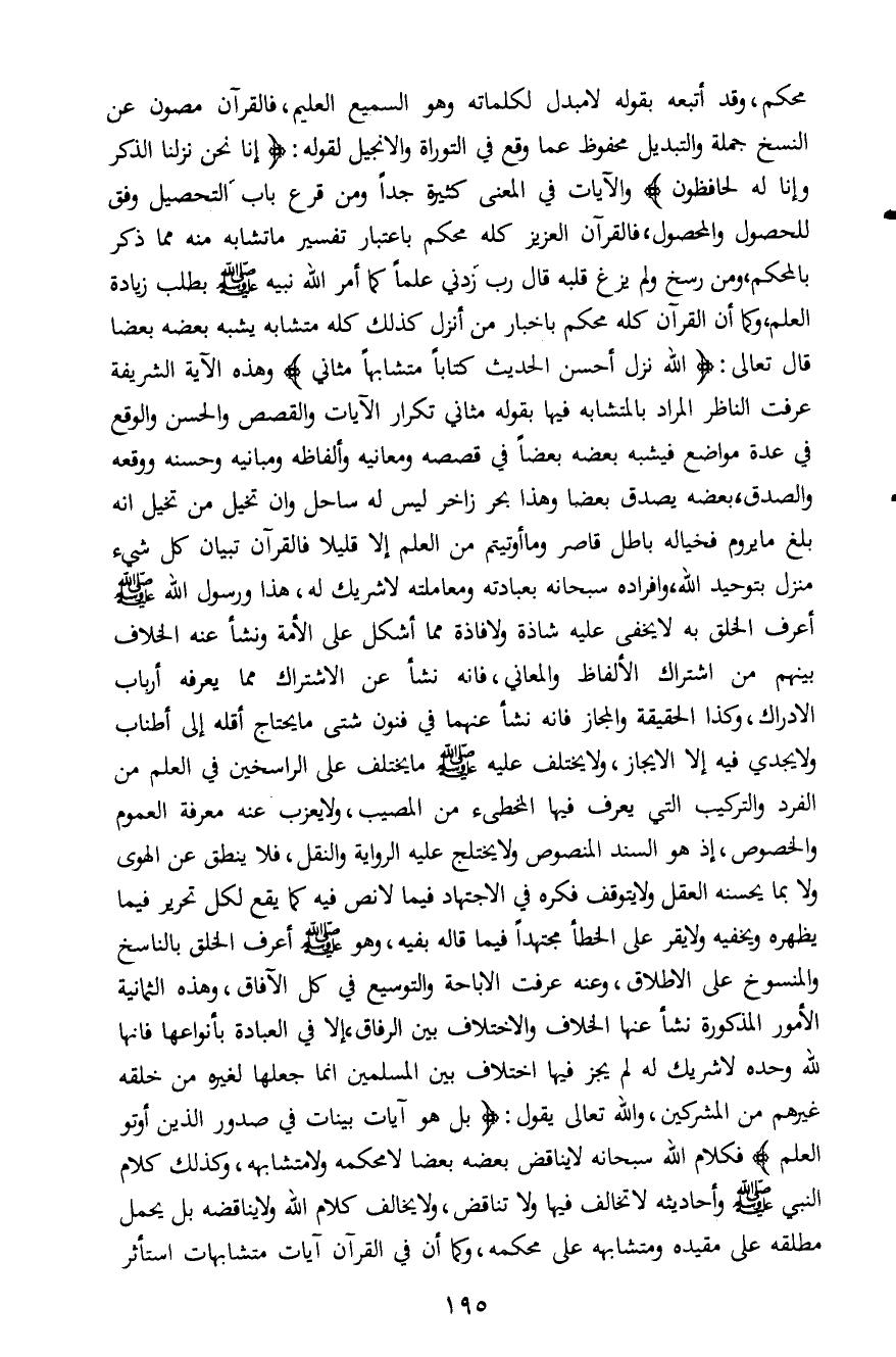 محكم، وقد أتبعه بقوله لا مبدل لكلماته وهو السميع العليم، فالقرآن مصون عن النسخ جملة والتبديل محفوظ عما وقع في التوراة والإنجيل لقوله: {إِنَّا نَحْنُ نَزَّلْنَا الذِّكْرَ وَإِنَّا لَهُ لَحَافِظُونَ} والآيات في المعنى كثيرة جداً ومن قرع باب التحصيل وفق للحصول والمحصول، فالقرآن العزيز كله محكم باعتبار تفسير ما تشابه منه مما ذكر بالمحكم، وعن رسخ ولم يزغ قلبه قال رب زدني علماً كما أمر الله نبيه صلى الله عليه وسلم بطلب زيادة العلم، وكما أن القرآن كله محكم بأخبار من أنزل كذلك كله متشابه يشبه بعضه بعضاً قال تعالى: {اللَّهُ نَزَّلَ أَحْسَنَ الْحَدِيثِ كِتَاباً مُتَشَابِهاً مَثَانِيَ} وهذه الآية الشريفة عرفت الناظر المراد بالمتشابه فيها بقوله مثاني تكرار الآيات والقصص والحسن والوقع في عدة مواضع فيشبه بعضه بعضاً في قصصه ومعانيه وألفاظه ومبانيه وحسنه ووقعه والصدق، بعضه يصدق بعضاً وهذا بحر زاخر ليس له ساحل وان تخيل من تخيل انه بلغ ما يروم فخياله باطل قاصر وما أوتيتم من العلم إلا قليلا فالقرآن تبيان كل شيء منزل بتوحيد الله، وإفراده سبحانه بعبادته ومعاملته لا شريك له، هذا ورسول الله صلى الله عليه وسلم أعرف الخلق به لا يخفى عليه شاذة ولا فاذة مما أشكل على الأمة ونشأ عنه الخلاف بينهم من اشتراك الألفاظ والمعاني، فانه نشأ عن الاشتراك مما يعرفه أرباب الإدراك، وكذا الحقيقة والمجاز فانه نشأ عنهما في فنون شتى ما يحتاج أقله إلى أطناب ولا يجدي فيه إلا الايجاز، ولا يختلف عليه صلى الله عليه وسلم ما يختلف على الراسخين في العلم من الفرد والتركيب التي يعرف فيها المخطىء من المصيب، ولا يعزب عنه معرفة العموم والخصوص، إذ هو السند المنصوص ولا يختلج عليه الرواية والنقل، فلا ينطق عن الهوى ولا بما يحسنه العقل ولا يتوقف فكره في الاجتهاد فيما لا نص فيه كما يقع لكل تحرير فيما يظهره ويخفيه ولا يقر على الخطأ مجتهداً فيما قاله بفيه، وهو صلى الله عليه وسلم أعرف الخلق بالناسخ والمنسوخ على الإطلاق، وعنه عرفت الإباحة والتوسيع في كل الآفاق، وهذه الثمانية الأمور المذكورة نشأ عنها الخلاف والاختلاف بين الرفاق إلا في العبادة بأنواعها فإنها لله وحده لا شريك له لم يجز فيها اختلاف بين المسلمين إنما جعلها لغيره من خلقه غيرهم من المشركين، والله تعالى يقول: {بَلْ هُوَ آيَاتٌ بَيِّنَاتٌ فِي صُدُورِ الَّذِينَ أُوتُوا الْعِلْمَ} فكلام الله سبحانه لا يناقض بعضه بعضاً لا محكمه ولا متشابهه، وكذلك كلام الني صلى الله عليه وسلم وأحاديثه لا تخالف فيها ولا تناقض، ولا يخالف كلام الله ولا يناقضه بل يحمل مطلقه على مقيده ومتشابهه على محكمه، وكما أن في القرآن آيات متشابهات استأثر