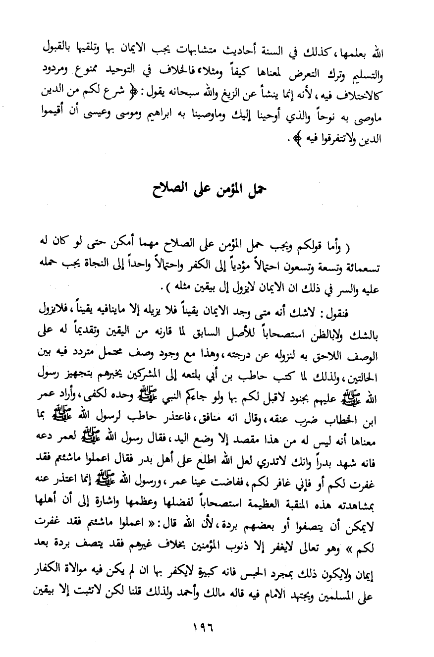 (وأما قولكم ويجب حمل المؤمن على الصلاح مهما أمكن حتى لو كان له تسعمائة وتسعة وتسعون احتمالاً مؤدياً إلى الكفر واحتمالاً واحداً إلى النجاة يجب حمله عليه والسر في ذلك ان الإيمان لا يزول إلا بيقين مثله) .
