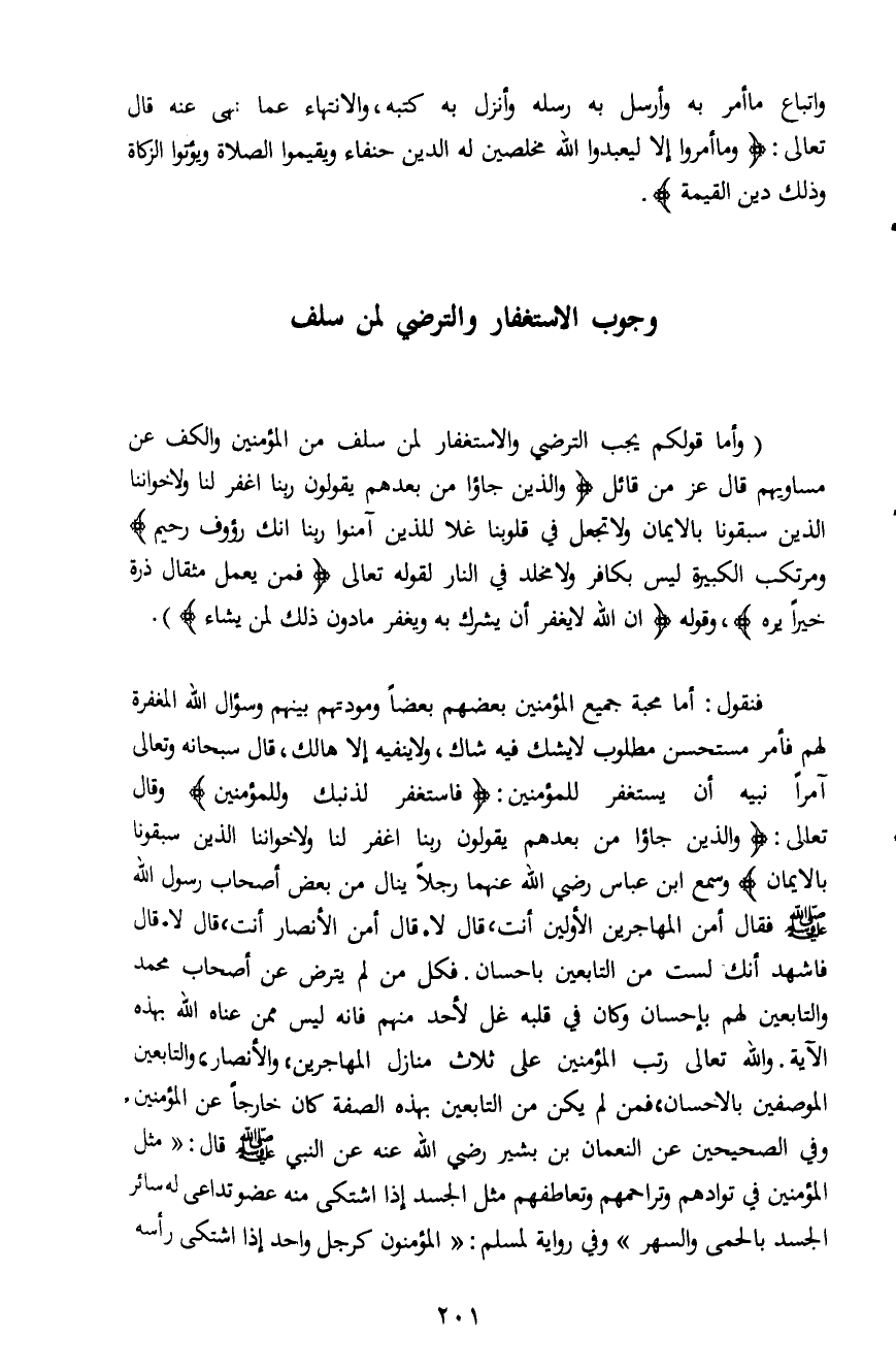 فنقول: أما محبة جميع المؤمنين بعضهم بعضاً ومودتهم بينهم وسؤال الله المغفرة لهم فأمر مستحسن مطلوب لا يشك فيه شاك، ولا ينفيه إلاَّ هالك، قال سبحانه وتعالى آمراً نبيه أن يستغفر للمؤمنين: {وَاسْتَغْفِرْ لِذَنْبِكَ وَلِلْمُؤْمِنِينَ} وقال تعالى: {وَالَّذِينَ جَاءُوا مِنْ بَعْدِهِمْ يَقُولُونَ رَبَّنَا اغْفِرْ لَنَا وَلإِخْوَانِنَا الَّذِينَ سَبَقُونَا بِالأِيمَانِ} وسمع ابن عباس رضي الله عنهما رجلاً ينال من بعض أصحاب رسول الله صلى الله عليه وسلم فقال أمن المهاجرين الأولين أنت، قال لا. قال أمن الأنصار أنت، قال لا. قال فاشهد أنك لست من التابعين بإحسان. فكل من لم يترض عن أصحاب محمد والتابعين لهم بإحسان وكان في قلبه غل لأحد منهم فانه ليس ممن عناه الله بهذه الآية. والله تعالى رتب المؤمنين على ثلاث منازل المهاجرين، والأنصار، والتابعين الموصفين بالإحسان، فمن لم يكن من التابعين بهذه الصفة كان خارجاً عن المؤمنين، وفي الصحيحين عن النعمان بن بشير رضي الله عنه عن النبي صلى الله عليه وسلم قال: "مثل المؤمنين في توادهم وتراحمهم وتعاطفهم مثل الجسد إذا اشتكى منه عضو تداعى له سائر الجسد بالحمى والسهر " وفي رواية لمسلم: "المؤمنون كرجل واحد إذا اشتكى رأسه