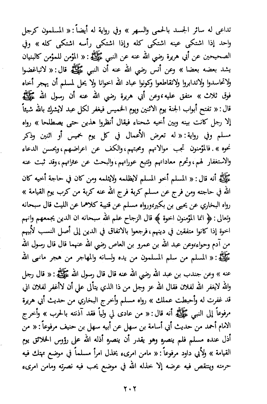 تداعى له سائر الجسد بالحمى والسهر" وفي رواية له أيضاً: " المسلمون كرجل واحد إذا اشتكى عينه اشتكى كله وإذا اشتكى رأسه اشتكى كله" وفي الصحيحين عن أبي هريرة رضي الله عنه عن النبي صلى الله عليه وسلم: "المؤمن للمؤمن كالبنيان يشد بعضه بعضاً" وعن أنس رضي الله عنه أن النبي صلى الله عليه وسلم قال: "لا تباغضوا ولا تحاسدوا ولا تدابروا ولا تقاطعوا وكونوا عباد الله إخوانا ولا يحل لمسلم أن يهجر أخاه فوق ثلاث" متفق عليه، وعن أبي هريرة رضي الله عنه أن رسول الله صلى الله عليه وسلم قال: "تفتح أبواب الجنة يوم الاثنين ويوم الخميس فيغفر لكل عبد لا يشرك بالله شيئاً إلاَّ رجل كانت بينه وبين أخيه شحناء فيقال أنظروا هذين حتى يصطلحا" رواه مسلم وفي روايةله: " تعرض الأعمال في كل يوم خميس أو اثنين وذكر نحوه". فالمؤمنون تجب موالاتهم ومحبتهم، والكف عن أعراضهم، ويحسن الدعاء والاستغفار لهم، وتحرم معاداتهم وتتبع عوراتهم، والبحث عن عثراتهم، وقد ثبت عنه صلى الله عليه وسلم أنه قال: "المسلم أخو المسلم لا يظلمه ولا يثلمه ومن كان في حاجة أخيه كان الله في حاجته ومن فرج عن مسلم كربة فرج الله عنه كربة من كرب يوم القيامة " رواه البخاري عن يحيى بن بكير، ورواه مسلم عن قتيبة كلاهما عن الليث قال سبحانه وتعالى: {إِنَّمَا الْمُؤْمِنُونَ إِخْوَةٌ} قال الزجاح علم الله سبحانه ان الدين يجمعهم وأنهم أخوة إذا كانوا متفقين في دينهم، فرجعوا بالاتفاق في الدين إلى أصل النسب لأبيهم من آدم وحواء، وعن عبد الله بن عمرو بن العاص رضي الله عنهما قال: قال رسول الله صلى الله عليه وسلم: "المسلم من سلم المسلمون من يده ولسانه والمهاجر من هجر ما نهى الله عنه" وعن جندب بن عبد الله رضي الله عنه قال: قال رسول الله صلى الله عليه وسلم: "قال رجل والله لا يغفر الله لفلان فقال الله عز وجل من ذا الذي يتألى عليّ أن لا أغفر لفلان إني قد غفرت له وأحبطت عملك" رواه مسلم وأخرج البخاري من حديث أبي هريرة مرفوعاً إلى النبي صلى الله عليه وسلم أنه قال: "من عادى لي ولياً فقد آذنته بالحرب" وأخرج الإمام أحمد من حديث أبي أمامه بن سهل عن أبيه سهل بن حنيف مرفوعاً: "من أذل عنده مسلماً فلم ينصره وهو يقدر أن ينصره أذله الله على رؤوس الخلائق يوم القيامة" ولأبي داود مرفوعاً: "ما من امرىء يخذل امرأ مسلماً في موضع تهتك فيه حرمته وينتقص فيه عرضه إلاَّ خذله الله في موضع يحب فيه نصرته وما من امرىء