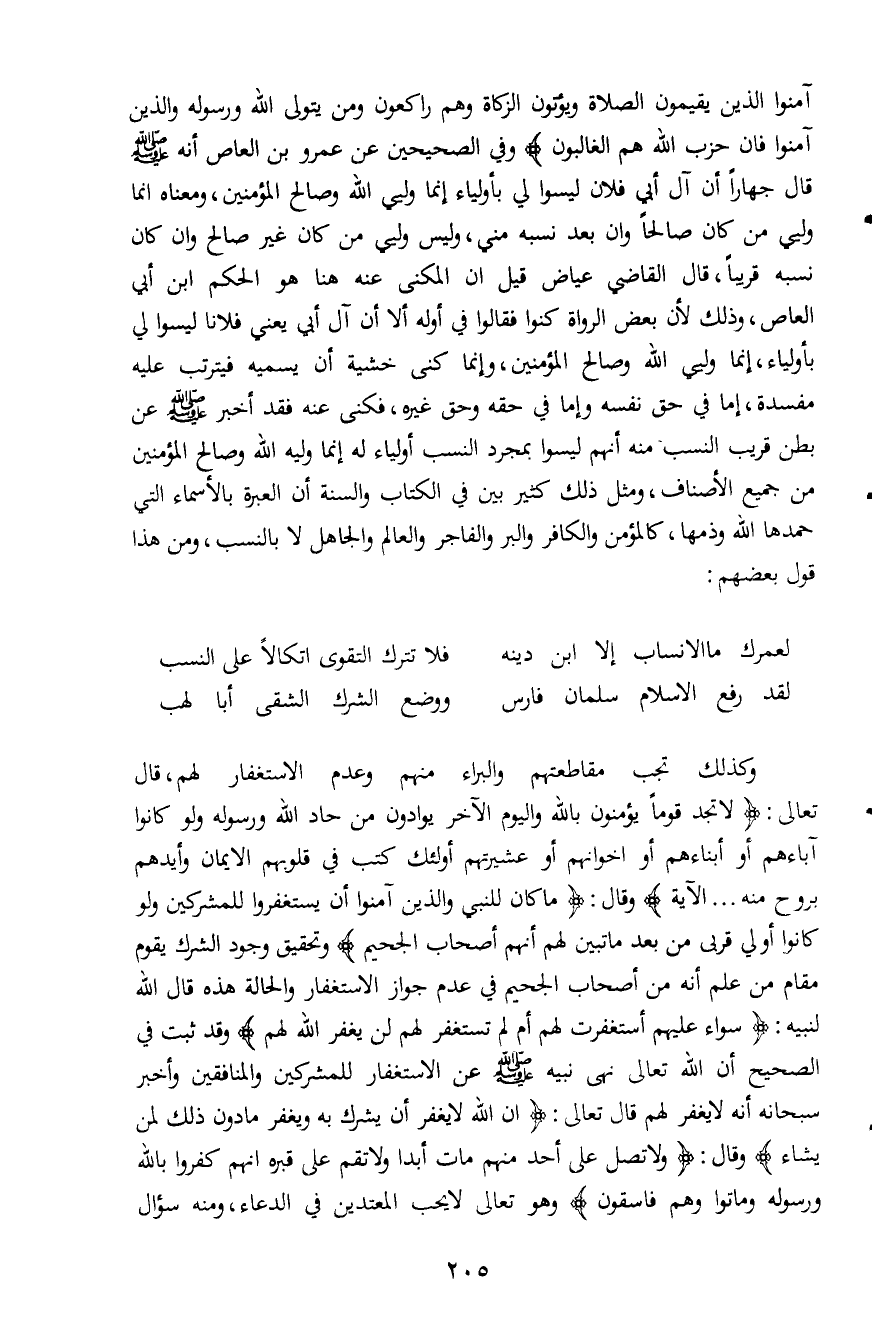آمَنُوا الَّذِينَ يُقِيمُونَ الصَّلاةَ وَيُؤْتُونَ الزَّكَاةَ وَهُمْ رَاكِعُونَ * وَمَنْ يَتَوَلَّ اللَّهَ وَرَسُولَهُ وَالَّذِينَ آمَنُوا فَإِنَّ حِزْبَ اللَّهِ هُمُ الْغَالِبُونَ} وفي الصحيحين عن عمرو بن العاص أنه صلى الله عليه وسلم قال جهاراً: " أن آل أبي فلان ليسوا لي بأولياء إنما وليي الله وصالح المؤمنين"، ومعناه إنما وليي من كان صالحاً وان بعد نسبه مني، وليس وليي من كان غير صالح وان كان نسبه قريباً، قال القاضي عياض قيل ان المكنى عنه هنا هو الحكم ابن أبي العاص، وذلك لأن بعض الرواة كنوا فقالوا في أوله إلاَّ أن آل أبي يعني فلانا ليسوا لي بأولياء، إنما وليي الله وصالح المؤمنين، وإنما كنى خشية أن يسميه فيترتب عليه مفسدة، إما في حق نفسه وإما في حقه وحق غيره، فكنى عنه فقد أخبر صلى الله عليه وسلم عن بطن قريب النسب منه أنهم ليسوا بمجرد النسب أولياء له إنما وليه الله وصالح المؤمنين من جميع الأصناف، ومثل ذلك كثير بين في الكتاب والسنة أن العبرة بالأسماء التي حمدها الله وذمها، كالمؤمن والكافر والبر والفاجر والعالم والجاهل لا بالنسب، ومن هذا قول بعضهم: