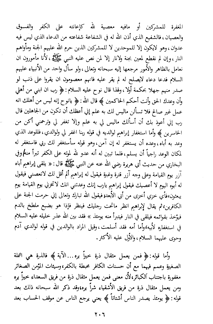 المغفرة للمشركين أو ما فيه معصية لله كإعانته على الكفر والفسوق والعصيان، فالشفيع الذي أذن الله له في الشفاعة شفاعته من الدعاء الذي ليس فيه عدوان، وهو لا يكون إلاَّ للموحدين لا للمشركين الذين حرم الله عليهم الجنة ومأواهم النار، وإن لم نقطع لمعين بجنة ولا نار إلاَّ لمن نص عليه النبي صلى الله عليه وسلم، لأنا مأمورون ان نعامل بالظاهر والأمور مرجعها إليه سبحانه وتعالى، ولو سأل واحد من الأنبياء عليهم السلام فدعا دعاء لا يصلح له لم يقر عليه فإنهم معصومون ان يقروا على ذنب لو صدر منهم جهلاً بحكمه أولاً، ولهذا قال نوح عليه السلام: {رَبِّ إِنَّ ابْنِي مِنْ أَهْلِي وَإِنَّ وَعْدَكَ الْحَقُّ وَأَنْتَ أَحْكَمُ الْحَاكِمِينَ} قال الله: {قَالَ يَا نُوحُ إِنَّهُ لَيْسَ مِنْ أَهْلِكَ إِنَّهُ عَمَلٌ غَيْرُ صَالِحٍ فَلا تَسْأَلْنِ مَا لَيْسَ لَكَ بِهِ عِلْمٌ إِنِّي أَعِظُكَ أَنْ تَكُونَ مِنَ الْجَاهِلِينَ * قَالَ رَبِّ إِنِّي أَعُوذُ بِكَ أَنْ أَسْأَلَكَ مَا لَيْسَ لِي بِهِ عِلْمٌ وَإِلَّا تَغْفِرْ لِي وَتَرْحَمْنِي أَكُنْ مِنَ الْخَاسِرِينَ} وأما استغفار إبراهيم لوالديه في قوله ربنا اغفر لي ولوالدي، فللوعد الذي وعد به أباه، وعده أن يستغفر له إن آمن، وهو قوله سأستغفر لك ربي فاستغفر له لمكان الوعد راجياً أن يسلم، فلما تبين له أنه عدو لله لموته على الكفر تبرأ منه، وفي البخاري من حديث أبي هريرة رضي الله عنه عن النبي صلى الله عليه وسلم قال: "يلقى إبراهيم أباه آزر يوم القيامة وعلى وجه آزر قترة وغبرة فيقول له إبراهيم ألم أقل لك لا تعصني فيقول له أبوه اليوم لا أعصيك فيقول إبراهيم يا رب إنك وعدتني انك لا تخزني يوم القيامة يوم يبعثون، فأي خزي أخزى من أبي الأبعد، فيقول الله تبارك وتعالى إني حرمت الجنة على الكافرين، ثم يقال لإبراهيم انظر ما تحت رجليك فينظر فإذا هو بضبع ملطخ بالدم فيؤخذ بقوائمه فيلقى في النار فيتبرأ منه يومئذ" فقد بين الله عذر خليله عليه الإسلام في استغفاره لأبيه، وأما أمه فقد أسلمت، وقيل المراد بالوالدين في قوله لوالدي آدم وحوى عليهما السلام، والأول عليه الأكثر.