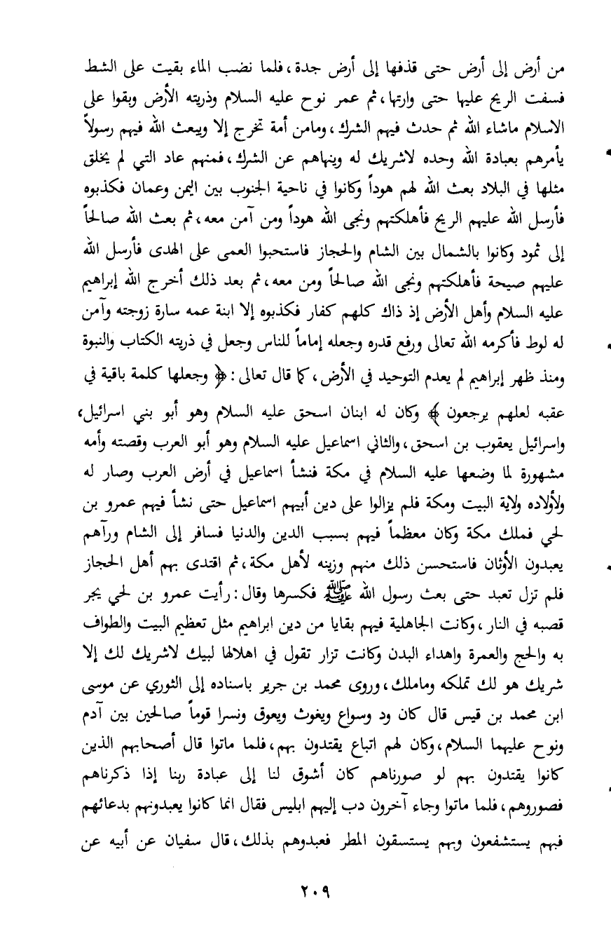 من أرض إلى أرض حتى قذفها إلى أرض جدة، فلما نضب الماء بقيت على الشط فسفت الريح عليها حتى وارتها، ثم عمر نوح عليه السلام وذريته الأرض وبقوا على الإسلام ما شاء الله ثم حدث فيهم الشرك، وما من أمة تخرج إلاَّ ويبعث الله فيهم رسولاً يأمرهم بعبادة الله وحده لا شريك له وينهاهم عن الشرك، فمنهم عاد التي لم يخلق مثلها في البلاد بعث الله لهم هوداً وكانوا في ناحية الجنوب بين اليمن وعمان فكذبوه فأرسل الله عليهم الريح فأهلكتهم ونجى الله هوداً ومن آمن معه، ثم بعث الله صالحاً إلى ثمود وكانوا بالشمال بين الشام والحجاز فاستحبوا العمى على الهدى فأرسل الله عليهم صيحة فأهلكتهم ونجى الله صالحاً ومن معه، ثم بعد ذلك أخرج الله إبراهيم عليه السلام وأهل الأرض إذ ذاك كلهم كفار فكذبوه إلاَّ ابنة عمه سارة زوجته وآمن له لوط فأكرمه الله تعالى ورفع قدره وجعله إماماً للناس وجعل في ذريته الكتاب والنبوة ومنذ ظهر إبراهيم لم يعدم التوحيد في الأرض، كما قال تعالى: {وَجَعَلَهَا كَلِمَةً بَاقِيَةً فِي عَقِبِهِ لَعَلَّهُمْ يَرْجِعُونَ} وكان له ابنان اسحق عليه السلام وهو أبو بني إسرائيل، وإسرائيل يعقوب بن اسحق، والثاني إسماعيل عليه السلام وهو أبو العرب وقصته وأمه مشهورة لما وضعها عليه السلام في مكة فنشأ إسماعيل في أرض العرب وصار له ولأولاده ولاية البيت ومكة فلم يزالوا على دين أبيهم إسماعيل حتى نشأ فيهم عمرو بن لحى فملك مكة وكان معظماً فيهم بسبب الدين والدنيا فسافر إلى الشام ورآهم يعبدون الأوثان فاستحسن ذلك منهم وزينه لأهل مكة، ثم اقتدى بهم أهل الحجاز فلم تزل تعبد حتى بعث رسول الله صلى الله عليه وسلم فكسرها وقال: " رأيت عمرو بن لحي يجر قصبه في النار"، وكانت الجاهلية فيهم بقايا من دين إبراهيم مثل تعظيم البيت والطواف به والحج والعمرة وإهداء البدن وكانت تزار تقول في اهلالها لبيك لا شريك لك إلاَّ شريك هو لك تملكه وما ملك، وروى محمد بن جرير بإسناده إلى الثوري عن موسى ابن محمد بن قيس قال كان ود وسواع ويغوث ويعوق ونسرا قوماً صالحين بين آدم ونوح عليهما السلام، وكان لهم اتباع يقتدون بهم، فلما ماتوا قال أصحابهم الذين كانوا يقتدون بهم لو صورناهم كان أشوق لنا إلى عبادة ربنا إذا ذكرناهم فصوروهم، فلما ماتوا وجاء آخرون دب إليهم إبليس فقال إنما كانوا يعبدونهم بدعائهم فبهم يستشفعون ربهم يستسقون المطر فعبدوهم بذلك، قال سفيان عن أبيه عن