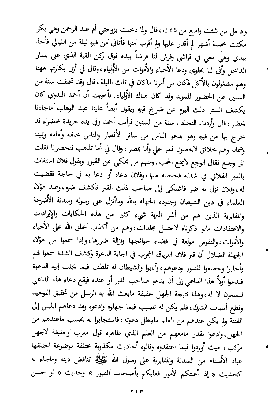وادخل من شئت وامنع من شئت، قال ولما دخلت بزوجتي أم عبد الرحمن وهي بكر مكثت خمسة أشهر لم أقدر عليها ولم أقرب منها فأتاني من قبره ليلة من الليالي فأخذ بيدي وهي معي في فراشي وفرش لنا فراشاً بيده فوق ركن القبة الذي على يسار الداخل وأتى لنا بحلوى ودعا الأحياء والأموات من الأولياء، وقال لي أزل بكارتها ههنا وهم مشغولون بالأكل فكان من أمرنا ما كان في تلك الليلة، قال وقد تخلفت سنة من السنين عن الحضور للمولد وقد كان هناك الأولياء، فأخبرت أن أحمد البدوي كان يكشف الستر ذلك اليوم عن ضريح قبره ويقول أبطأ علينا عبد الوهاب ما جاءنا يحضر، قال وأردت التخلف سنة من السنين فرأيت أحمد وفي يده جريدة خضراء قد خرج بها من قبره وهو يدعو الناس من سائر الأقطار والناس خلفه وأمامه ويمينه وشماله وهم خلائق لا يحصون فمر علي وأنا بمصر، وقال لي أما تذهب فتحضرنا فقلت إني وجميع فقال الوجع لا يمنع المحب. ومنهم من يحكي عن القبور ويقول فلان استغاث بالقبر الفلاني في شدته فخلصه منها، وفلان دعاه أو دعا به في حاجة فقضيت له، وفلان نزل به ضر فاشتكى إلى صاحب ذلك القبر فكشف ضره، وعند هؤلاء العلماء في دين الشيطان وجنوده الجهلة بالله وما أنزل على رسوله وسدنة الأضرحة والمقابرية الذين هم من أشر البرية شيء كثير من هذه الحكايات والإيرادات والاعتقادات ما لو ذكرناه لاحتمل مجلدات، وهم من أكذب خلق الله على الأحياء والأموات، والنفوس مولعة في قضاء حوائجها وإزالة ضررها، وإذا سمعوا من هؤلاء الجهلة الضلال أن قبر فلان الترياق المجرب في إجابة الدعوة كشف الشدة سمعوا لهم وأجابوا وخضعوا للقبور ودعوهم، وأنابوا والشيطان له تلطف فيما يجلب إليه الدعوة فيدعوا أولاً هذا الداعي إلى أن يدعو صاحب القبر أو عنده فيقع دعاء هذا الداعي للملعون لا له، وهذا نتيجة الجهل بحقيقة ما بعث الله به الرسل من تحقيق التوحيد وقطع أسباب الشرك، فلم يكن له نصيب فيما جهلوه وادعوه وقد دعاهم إبليس إلى الفتنة ولم يكن عندهم من العلم ما يبطل دعوته، فاستجابوا له بحسب ما عندهم من الجهل، وادعوا بقدر ما معهم من العلم الذي ظاهره قول معرب وحقيقة لا جهل مركب، حيث أوردوا فيما اعتقدوه وقالوه أحاديث مكذوبة مخلقة موضوعة اختلقها عباد الأصنام من السدنة والمقابرية على رسول الله صلى الله عليه وسلم تناقض دينه وما جاء به كحديث " إذا أعيتكم الأمور فعليكم بأصحاب القبور" وحديث "لو حسن