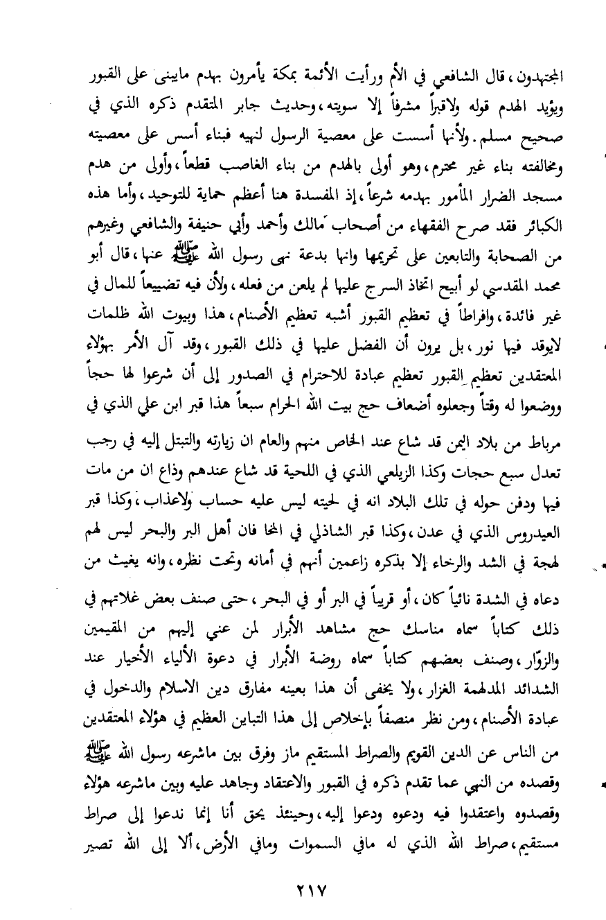 المجتهدون، قال الشافعي في الأم ورأيت الأئمة بمكة يأمرون بهدم ما يبنى على القبور ويؤيد الهدم قوله ولا قبراً مشرفاً إلاَّ سويته، وحديث جابر المتقدم ذكره الذي في صحيح مسلم. ولأنها أسست على معصية الرسول لنهيه فبناء أسس على معصيته ومخالفته بناء غير محترم، وهو أولى بالهدم من بناء الغاصب قطعاً، وأولى من هدم مسجد الضرار المأمور بهدمه شرعاً، إذ المفسدة هنا أعظم حماية للتوحيد، وأما هذه الكبائر فقد صرح الفقهاء من أصحاب مالك وأحمد وأبي حنيفة والشافعي وغيرهم من الصحابة والتابعين على تحريمها وأنها بدعة نهى رسول الله صلى الله عليه وسلم عنها، قال أبو محمد المقدسي لو أبيح اتخاذ السرج عليها لم يلعن من فعله، ولأن فيه تضييعاً للمال في غير فائدة، وافراطاً في تعظيم القبور أشبه تعظيم الأصنام، هذا وبيوت الله ظلمات لا يوقد فيها نور، بل يرون أن الفضل عليها في ذلك القبور، وقد آل الأمر بهؤلاء المعتقدين تعظيم القبور تعظيم عبادة للاحترام في الصدور إلى أن شرعوا لها حجاً ووضعوا له وقتاً وجعلوه أضعاف حج بيت الله الحرام سبعاً هذا قبر ابن علي الذي في مرباط من بلاد اليمن قد شاع عند الخاص منهم والعام ان زيارته والتبتل إليه في رجب تعدل سبع حجات وكذا الزيلعي الذي في اللحية قد شاع عندهم وذاع ان من مات فيها ودفن حوله في تلك البلاد انه في لحيته ليس عليه حساب ولا عذاب، وكذا قبر العيدروس الذي في عدن، وكذا قبر الشاذلي في المخافان أهل البر والبحر ليس لهم لهجة في الشد والرخاء إلاَّ بذكره زاعمين أنهم في أمانه وتحت نظره، وانه يغيث من دعاه في الشدة نائياً كان، أو قريباً في البر أو في البحر، حتى صنف بعض غلاتهم في ذلك كتاباً سماه مناسك حج مشاهد الأبرار لمن عني إليهم من المقيمين والزوّار، وصنف بعضهم كتاباً سماه روضة الأبرار في دعوة الأولياء الأخيار عند الشدائد المدلهمة الغزار، ولا يخفى أن هذا بعينه مفارق دين الإسلام والدخول في عبادة الأصنام، ومن نظر منصفاً بإخلاص إلى هذا التباين العظيم في هؤلاء المعتقدين من الناس عن الدين القويم والصراط المستقيم ماز وفرق بين ما شرعه رسول الله صلى الله عليه وسلم وقصده من النهي عما تقدم ذكره في القبور والاعتقاد وجاهد عليه وبين ما شرعه هؤلاء وقصدوه واعتقدوا فيه ودعوه ودعوا إليه، وحينئذ يحق أنا إنما ندعوا إلى صراط مستقيم، صراط الله الذي له ما في السموات وما في الأرض، إلاَّ إلى الله تصير