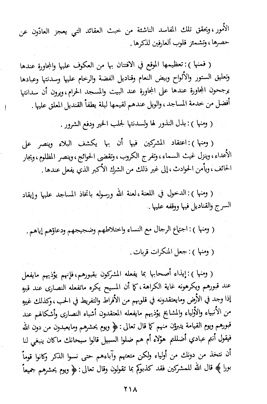 (ومنها) : اعتقاد المشركين فيها أن بها يكشف البلاء وينصر على الأعداء، وينزل غيث السماء، وتفرج الكروب، وتقضى الحوائج، وينصر المظلوم، ويجار الحائف، ويأمن الحوادث، إلى غير ذلك من الشرك الأكبر الذي يفعل عندها.