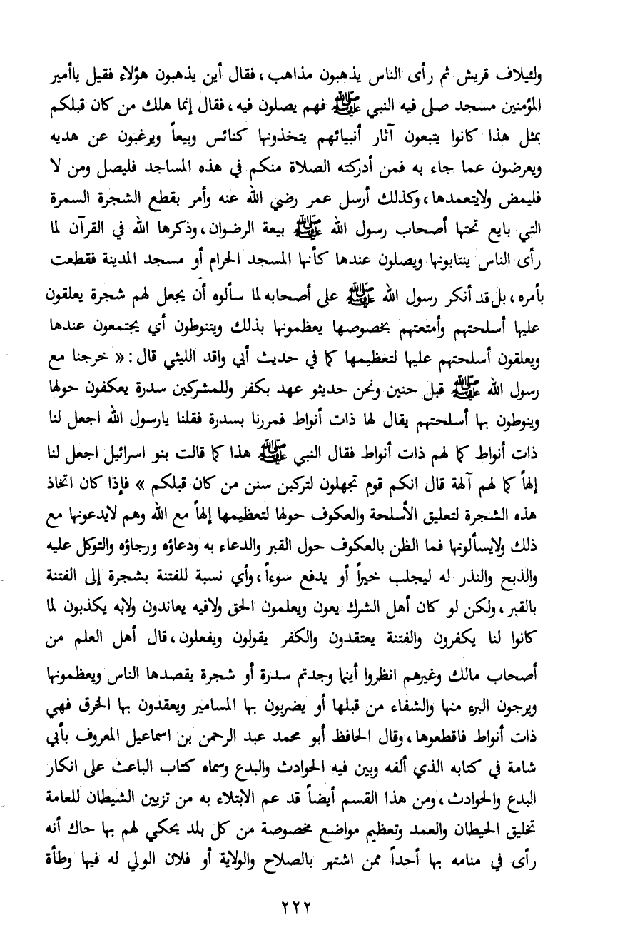 ولئيلاف قريش ثم رأى الناس يذهبون مذاهب، فقال أين يذهبون هؤلاء فقيل يا أمير المؤمنين مسجد صلى فيه النبي صلى الله عليه وسلم فهم يصلون فيه، فقال إنما هلك من كان قبلكم بمثل هذا كانوا يتبعون آثار أنبيائهم يتخذونها كنائس وبيعاً يرغبون عن هديه ويعرضون عما جاء به فمن أدركته الصلاة منكم في هذه المساجد فليصل ومن لا فليمض ولا يتعمدها، وكذلك أرسل عمر رضي الله عنه وأمر بقطع الشجرة السمرة التي بايع تحتها أصحاب رسول الله صلى الله عليه وسلم بيعة الرضوان، وذكرها الله في القرآن لما رأى الناس ينتابونها ويصلون عندها كأنها المسجد الحرام أو مسجد المدينة فقطعت بأمره، بل قد أنكر رسول الله صلى الله عليه وسلم على أصحابه لما سألوه أن يجعل لهم شجرة يعلقون عليها أسلحتهم وأمتعتهم بخصوصها يعظمونها بذلك ويتنوطون أي يجتمعون عندها ويعلقون أسلحتهم عليها لتعظيمها كما في حديث أبي راقد الليثي قال: "خرجنا مع رسول الله صلى الله عليه وسلم قبل حنين ونحن حديثو عهد بكفر وللمشركين سدرة يعكفون حولها وينوطون بها أسلحتهم يقال لها ذات أنواط فمررنا بسدرة فقلنا يا رسول الله اجعل لنا ذات أنواط كما لهم ذات أنواط فقال النبي صلى الله عليه وسلم: "هذا كما قالت بنو إسرائيل اجعل لنا إلهاً كما لهم آلهة قال إنكم قوم تجهلون لتركبن سنن من كان قبلكم" فإذا كان اتخاذ هذه الشجرة لتعليق الأسلحة والعكوف حولها لتعظيمها إلهاً مع الله وهم لا يدعونها مع ذلك ولا يسألونها فما الظن بالعكوف حول القبر والدعاء به ودعاؤه ورجاؤه والتوكل عليه والذبح والنذر له ليجلب خيراً أو يدفع سوءاً، وأي نسبة للفتنة بشجرة إلى الفتنة بالقبر، ولكن لو كان أهل الشرك يعون ويعلمون الحق ولا فيه يعاندون ولا به يكذبون لما كانوا لنا يكفرون والفتنة يعتقدون والكفر يقولون ويفعلون، قال أهل العلم من أصحاب مالك وغيرهم انظروا أينما وجدتم سدرة أو شجرة يقصدها الناس ويعظمونها ويرجون البرء منها والشفاء من قبلها أو يضربون بها المسامر ويعقدون بها الخرق فهي ذات أنواط فاقطعوها، وقال الحافظ أبو محمد عبد الرحمن بن إسماعيل المعروف بأبي شامة في كتابه الذي ألفه وبين فيه الحوادث والبدع وسماه كتاب الباعث على إنكار البدع والحوادث، ومن هذا القسم أيضاً قد عم الابتلاء به من تزيين الشيطان للعامة تخليق الحيطان والعمد وتعظيم مواضع مخصوصة من كل بلد يحكي لهم بها حاك أنه رأى في منامه بها أحداً ممن اشتهر بالصلاح والولاية أو فلان الولي له فيها وطأة