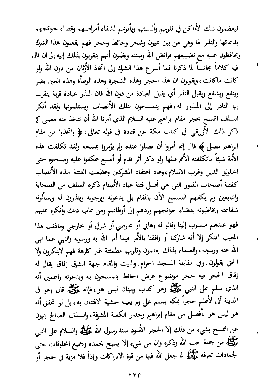 فيعظمون تلك الأماكن في قلوبهم وألسنتهم ويأتونهم لشفاء أمراضهم وقضاء حوائجهم بدعائها والنذر لها وهي من بين عيون وشجر وحائط وحجر فهم يفعلون هذا الشرك ويحافظون عليه مع تضييعهم فرائض الله وسننه ويظنون أنهم يتقربون بذلك إليه إلى ان قال فيه كلاماً مجانساً لما ذكرنا فما أسرع هذا الشرك إلى اتخاذ الأوثان من دون الله ولو كانت ما كانت، ويقولون ان هذا الحجر وهذه الشجرة وهذه الوطأة وهذه العين يضر وينفع ويشفع ويقبل النذر أي يقبل العبادة من دون الله فان النذر عبادة قربة يتقرب بها الناذر إلى المنذور له، فهم يتمسحون بتلك الأنصاب ويستلمونها ولقد أنكر السلف التمسح بحجر مقام إبراهيم عليه السلام الذي أمرنا الله أن نتخذ منه مصلى كما ذكر ذلك الأزريقي في كتاب مكة عن قتادة في قوله تعالى: {وَاتَّخِذُوا مِنْ مَقَامِ إِبْرَاهِيمَ مُصَلّىً} قال إنما أمروا أن يصلوا عنده ولم يؤمروا بمسحه ولقد تكلفت هذه الأمة شيئاً ما تكلفته الأمم قبلها ولو ذكر أثر قدم أو أصبع عكفوا عليه ومسحوه حتى اخلولق الدين وغرب الإسلام، وعاد اعتقاد المشركين وعظمت الفتنة بهذه الأنصاب كفتنة أصحاب القبور التي هي أصل فتنة عباد الأصنام ذكره السلف من الصحابة والتابعين ولم يكفهم التسمح الآن بالمقام بل يدعونه ويرجونه وينذرون له ويسألونه شفاعته ويخاطبونه بقضاء حوائجهم وردهم إلى أوطانهم ومن عاب ذلك وأنكره عليهم فهو عندهم منسوب إلينا وقالوا له وهابي أو عارضي أو شرقي أو خارجي وما ذنب هذا المعيب المنكر إلاَّ أنه شاكنا أو وافقنا بالأمر فيما أمر الله به ورسوله والنهي عما نهى الله عنه ورسوله، والعلماء بذلك يعلمون وقلوبهم مطمئنة غير كارهة فهم لا ينكرون ولا الحق يقولون. وفي مقابلة المسجد الحرام. والبيت والمقام جهة الشرق زقاق يقال له زقاق الحجر فيه حجر موضوع عرض الحائط يتمسحون به ويدعونه زاعمين أنه الذي سلم على النبي صلى الله عليه وسلم وهو كذب وبهتان ليس هو، فإنه صلى الله عليه وسلم قال وهو في المدينة أني لأعلم حجراً بمكة يسلم عليّ ولم يعينه خشية الافتتان به، بل لو تحقق أنه هو ليس هو بأفضل من مقام إبراهيم وجدار الكعبة المشرفة، والسلف الصالح ينهون عن التمسح بشيء من ذلك إلاَّ الحجر الأسود سنة رسول الله صلى الله عليه وسلم والسلام على النبي صلى الله عليه وسلم من جملة حب الله وذكره وان من شيء إلا يسبح بحمده وجميع المخلوقات حتى الجمادات تعرفه صلى الله عليه وسلم لما جعل الله فيها من قوة الادراكات وإذاً فلا مزية في حجر أو
