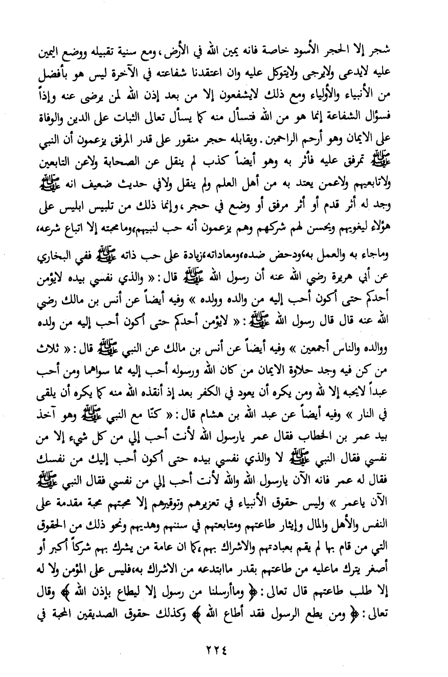 شجر إلاَّ الحجر الأسود خاصة فانه يمين الله في الأرض، ومع سنية تقبيله ووضع الجبين عليه لا يدعى ولا يرجى ولا يتوكل عليه وان اعتقدنا شفاعته في الآخرة ليس هو بأفضل من الأنبياء والأولياء ومع ذلك لا يشفعون إلاَّ من بعد إذن الله لمن يرضى عنه وإذاً فسؤال الشفاعة إنما هو من الله فسأل منه كما يسأل تعالى الثبات على الدين والوفاة على الإيمان وهو أرحم الراحمين. ويقابله حجر منقور على قدر المرفق يزعمون أن النبي صلى الله عليه وسلم تمرفق عليه فأثر به وهو أيضاً كذب لم ينقل عن الصحابة ولا عن التابعين ولا تابعيهم ولا عمن يعتد به من أهل العلم ولم ينقل ولا في حديث ضعيف انه صلى الله عليه وسلم وجد له أثر قدم أو أثر مرفق أو وضع في حجر، وإنما ذلك من تلبيس إبليس على هؤلاء ليغويهم ويحسن لهم شركهم وهم يزعمون أنه حب لنبيهم، وما محبته إلاَّ اتباع شرعه، وما جاء به والعمل به، ودحض ضده، ومعاداته، زيادة على حب ذاته صلى الله عليه وسلم ففي البخاري عن أبي هريرة رضي الله عنه أن رسول الله صلى الله عليه وسلم قال: "والذي نفسي بيده لا يؤمن أحدكم حتى أكون أحب إليه من والده وولده " وفيه أيضاً عن أنس بن مالك رضي الله عنه قال قال رسول الله صلى الله عليه وسلم: " لا يؤمن أحدكم حتى أكون أحب إليه من ولده ووالده والناس أجمعين" وفيه أيضاً عن أنس بن مالك عن النبي صلى الله عليه وسلم قال: " ثلاث من كن فيه وجد حلاوة الإيمان من كان الله ورسوله أحب إليه مما سواهما ومن أحب عبداً لا يحبه إلاَّ لله ومن يكره أن يعود في الكفر بعد إذ أنقذه الله منه كما يكره أن يلقى في النا ر" وفيه أيضاً عن عبد الله بن هشام قال: "كنا مع النبي صلى الله عليه وسلم وهو آخذ بيد عمر بن الخطاب فقال عمر: يا رسول الله لأنت أحب إليّ من كل شيء إلاَّ من نفسي فقال النبي صلى الله عليه وسلم والذي نفسي بيده حتى أكون أحب إليك من نفسك فقال له عمر فانه الآن يا رسول الله والله لأنت أحب إليّ من نفسي فقال النبي صلى الله عليه وسلم الآن يا عمر" وليس حقوق الأنبياء في تعزيرهم وتوقيرهم إلاَّ مجتهم محبة مقدمة على النفس والأهل والمال وإيثار طاعتهم ومتابعتهم في ستهم وهديهم ونحو ذلك من الحقوق التي من قام بها لم يقم بعبادتهم والإشراك بهم، كما ان عامة من يشرك بهم شيئاً أكبر أو أصغر يترك ما عليه من طاعتهم بقدر ما ابتدعه من الإشراك به، فليس على المؤمن ولا له إلاَّ طلب طاعتهم قال تعالى: {وَمَا أَرْسَلْنَا مِنْ رَسُولٍ إِلَّا لِيُطَاعَ بِإِذْنِ اللَّهِ} وقال تعالى: {مَنْ يُطِعِ الرَّسُولَ فَقَدْ أَطَاعَ اللَّهَ} وكذلك حقوق الصديقين المحبة في