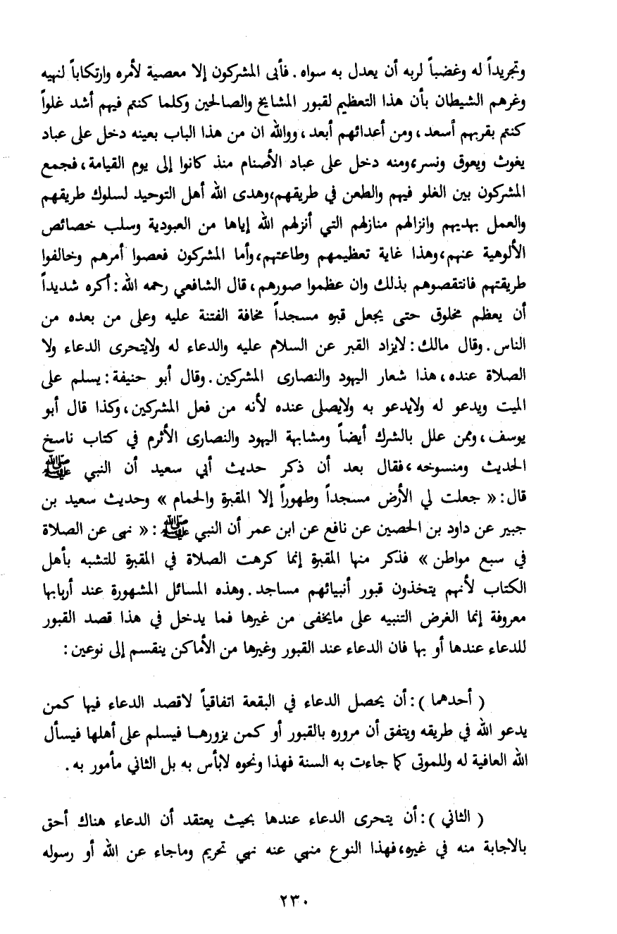 وتجريداً له وغضباً لربه أن يعدل به سواه. فأبى المشركون إلاَّ معصية لأمره وارتكاباً لنهيه وغرهم الشيطان بأن هذا التعظيم لقبور المشايخ والصالحين وكلما كنتم فيهم أشد غلواً كنتم بقربهم أسعد، ومن أعدائهم أبعد، ووالله ان من هذا الباب بعينه دخل على عباد يغوث ويعوق ونسر، ومنه دخل على عباد الأصنام منذ كانوا إلى يوم القيامة، فجمع المشركون بين الغلو فيهم والطعن في طريقهم، وهدى الله أهل التوحيد لسلوك طريقهم والعمل بهديهم وانزلهم منازلهم التي أنزلهم الله إياها من العبودية وسلب خصائص الألوهية عنهم، وهذا غاية تعظيمهم وطاعتهم، وأما المشركون فعصوا أمرهم وخالفوا طريقتهم فانتقصوهم بذلك وان عظموا صورهم، قال الشافعي رحمه الله: أكره شديداً أن يعظم مخلوق حتى يجعل قبره مسجداً مخافة الفتنة عليه وعلى من بعده من الناس. وقال مالك: لا يزاد القبر عن السلام عليه والدعاء له ولا يتحرى الدعاء ولا الصلاة عنده، هذا شعار اليهود والنصارى المشركين. وقال أبو حنيفة: يسلم على الميت ويدعو له ولا يدعو به ولا يصلى عنده لأنه من فعل المشركين، وكذا قال أبو يوسف، وممن علل بالشرك أيضاً ومشابهة اليهود والنصارى الأثرم في كتاب ناسخ الحديث ومنسوخه، فقال بعد أن ذكر حديث أبي سعيد أن النبي صلى الله عليه وسلم قال: "جعلت لي الأرض مسجداً طهوراً إلاَّ القبر والحمام" وحديث سعيد بن جبير عن داود بن الحصين عن نافع عن ابن عمر أن النبي صلى الله عليه وسلم: "نهى عن الصلاة في سبع مواطن" فذكر منها المقبرة إنما كرهت الصلاة في المقبرة للتشبه بأهل الكتاب لأنهم يتخذون قبور أنبيائهم مساجد. وهذه المسائل المشهورة عند أربابها معروفة إنما الغرض التنبيه على ما يخفى من غيرها فما دخل في هذا قصد القبور للدعاء عندها أو بها فان الدعاء عند القبور وغيرها من الأماكن ينقسم إلى نوعين: