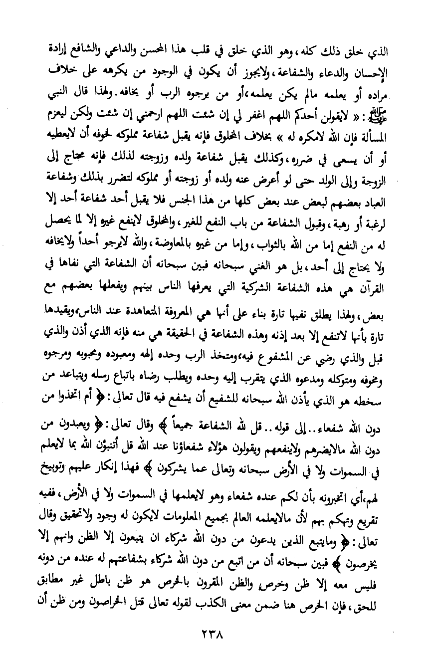الذي خلق ذلك كله، وهو الذي خلق في قلب هذا المحسن والداعي والشافع إرادة الإحسان والدعاء والشفاعة، ولا يجوز أن يكون في الوجود من يكرهه على خلاف مراده أو يعلمه ما لم يكن يعلمه، أو من يرجوه الرب أو يخافه. ولهذا قال النبي صلى الله عليه وسلم: "لا يقولن أحدكم اللهم اغفر لي ان شئت اللهم ارحمني ان شئت ولكن ليعزم المسألة فإن الله لا مكره له" بخلاف المخلوق فإنه يقبل شفاعة مملوكه لخوفه أن لا يعطيه أو أن يسعى في ضرره، وكذلك قبل شفاعة ولده وزوجته لذلك فإنه محتاج إلى الزوجة والى الولد حتى لو أعرض عنه ولده أو زوجته أو مملوكه لتضرر بذلك وشفاعة العباد بعضهم لبعض عند بعض كلها من هذا الجنس فلا يقبل أحد شفاعة أحد إلاَّ لرغبة أو رهبة، وقبول الشفاعة من باب النفع للغير، والمخلوق لا ينفع غيرهم إلاَّ لما يحصل له من النفع إما من الله بالثواب، وإما من غيره بالمعاوضة، والله لا يرجو أحداً ولا يخافه ولا يحتاج إلى أحد، بل هو الغني سبحانه فبين سبحانه أن الشفاعة التي نفاها في القرآن هي هذه الشفاعة الشركية التي يعرفها الناس بينهم ويفعلها بعضهم مع بعض، ولهذا يطلق نفيها تارة بناء على أنها هي المعروفة المتعاهدة عند الناس، ويقيدها تارة بأنها لا تنفع إلاَّ بعد إذنه وهذه الشفاعة في الحقيقة هي منه فإنه الذي أذن والذي قبل والذي رضي عن المشفوع فيه، ومتخذ الرب وحده إلهه ومعبوده ومحبوبه ومرجوه ومخوفه ومتوكله ومدعوه الذي يتقرب إليه وحده ويطلب رضاه بإتباع رسله ويتباعد من سخطه هو الذي يأذن الله سبحانه للشفيع أن يشفع فيه قال تعالى: {أَمِ اتَّخَذُوا مِنْ دُونِ اللَّهِ شُفَعَاءَ..} إلى قوله {.. قُلْ لِلَّهِ الشَّفَاعَةُ جَمِيعاً} وقال تعالى: {وَيَعْبُدُونَ مِنْ دُونِ اللَّهِ مَا لا يَضُرُّهُمْ وَلا يَنْفَعُهُمْ وَيَقُولُونَ هَؤُلاءِ شُفَعَاؤُنَا عِنْدَ اللَّهِ قُلْ أَتُنَبِّئُونَ اللَّهَ بِمَا لا يَعْلَمُ فِي السَّمَاوَاتِ وَلا فِي الأَرْضِ سُبْحَانَهُ وَتَعَالَى عَمَّا يُشْرِكُونَ} فهذا إنكار عليهم وتوبيخ لهم، أي أتخبرونه بأن لكم عنده شفعاء وهو لا يعلمها في السموات ولا في الأرض، ففيه تقريع وتهكم بهم لأن ما لا يعلمه العالم بجميع المعلومات لا يكون له وجود ولا تحقيق وقال تعالى: {وَمَا يَتَّبِعُ الَّذِينَ يَدْعُونَ مِنْ دُونِ اللَّهِ شُرَكَاءَ إِنْ يَتَّبِعُونَ إِلَّا الظَّنَّ وَإِنْ هُمْ إِلاَّ يَخْرُصُونَ} فبين سبحانه أن من اتبع من دون الله شركاء بشفاعتهم له عنده من دونه فليس معه إلاَّ ظن وخرص والظن المقرون بالحرص هو ظن باطل غير مطابق للحق، فإن الخرص هنا ضمن معنى الكذب لقوله تعالى: {قُتِلَ الْخَرَّاصُونَ} ومن ظن أن