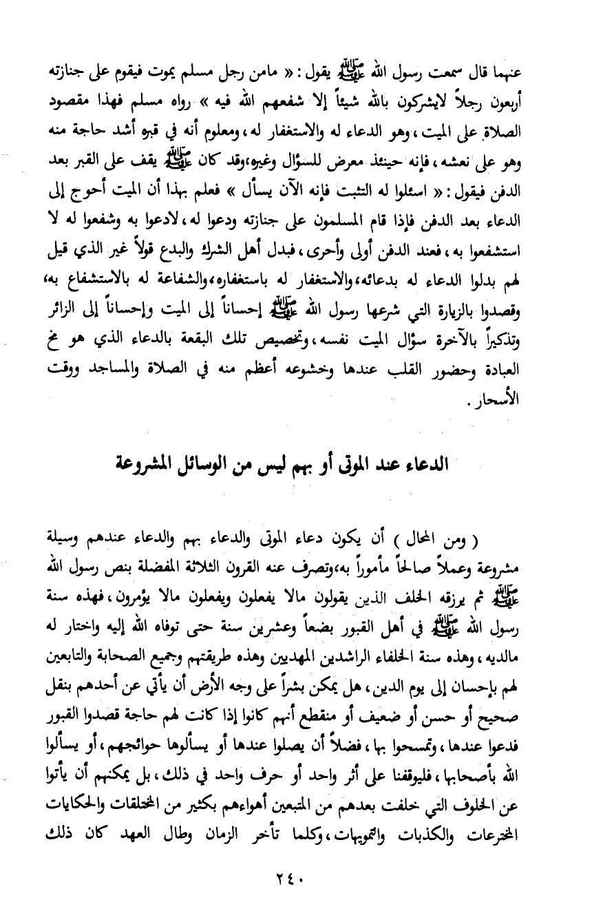 (ومن المحال) أن يكون دعاء الموتى والدعاء بهم والدعاء عندهم وسيلة مشروعة وعملاً صالحاً مأموراً به، وتصرف عنه القرون الثلاثة المفضلة بنص رسول الله صلى الله عليه وسلم ثم يرزقه الخلف الذين يقولون ما لا يفعلون ويفعلون ما لا يؤمرون، فهذه سنة رسول الله صلى الله عليه وسلم في أهل القبور بضعاً وعشرين سنة حتى توفاه الله إليه واختار له ما لديه، وهذه سنة الخلفاء الراشدين المهديين وهذه طريقتهم وجميع الصحابة والتابعين لهم بإحسان إلى يوم الدين، هل يمكن بشراً على وجه الأرض أن يأتي عن أحدهم بنقل صحيح أو حسن أو ضعيف أو منقطع أنهم كانوا إذا كانت لهم حاجة قصدوا القبور فدعوا عندها، وتمسحوا بها، فضلاً أن يصلوا عندها أو يسألوها حوائجهم، أو يسألوا الله بأصحابها، فليوقفنا على أثر واحد أو حرف واحد في ذلك، بل يمكنهم أن يأتوا عن الخلوف التي خلفت بعدهم من المتبعين أهواءهم بكثير من المختلقات والحكايات المخترعات والكذبات والتمويهات، وكلما تأخر الزمان وطال العهد كان ذلك