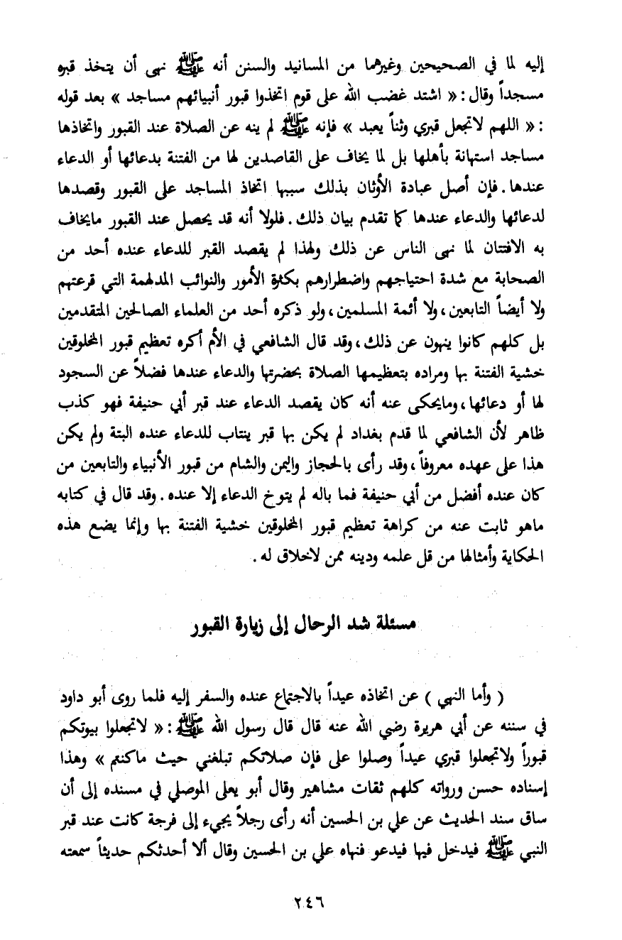 (وأما النهي) عن اتخاذه عيداً بالاجتماع عنده والسفر إليه فلما روى أبو داود في سننه عن أبي هريرة رضي الله عنه قال قال رسول الله صلى الله عليه وسلم: "لا تجعلوا بيوتكم قبوراً ولا تجعلوا قبري عيداً وصلوا عليّ فإن صلاتكم تبلغني حيث ما كنتم" وهذا إسناده حسن ورواته كلهم ثقات مشاهير وقال أبو يعلى الموصلي في مسنده إلى أن ساق سند الحديث عن علي بن الحسين أنه رأى رجلاً يجيء إلى فرجة كانت عند قبر النبي صلى الله عليه وسلم فيدخل فيها فيدعو فنهاه علي بن الحسين وقال ألا أحدثكم حديثاً سمعته