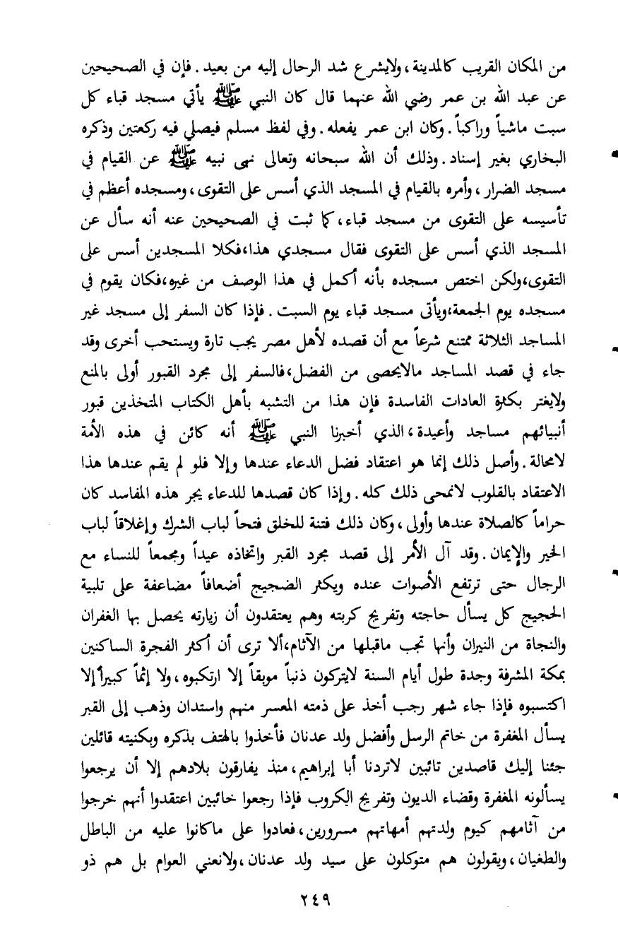 من المكان القريب كالمدينة، ولا يشرع شد الرحال إليه من بعيد. فإن في الصحيحين عن عبد الله بن عمر رضي الله عنهما قال كان النبي يأتي مسجد قباء كل سبت ماشياً وراكباً. وكان ابن عمر يفعله. وفي لفظ مسلم فيصلي فيه ركعتين وذكره البخاري بغير إسناد. وذلك أن الله سبحانه وتعالى نهى نبيه صلى الله عليه وسلم عن القيام في مسجد الضرار، وأمره بالقيام في المسجد الذي أسس على التقوى، ومسجده أعظم في تأسيسه على التقوى من مسجد قباء، كما ثبت في الصحيحين عنه أنه سأل عن المسجد الذي أسس على التقوى فقال مسجدي هذا، فكلا المسجد أسس على التقوى، ولكن اختص مسجده بأنه أكمل في هذا الوصف من غيره، فكان يقوم في مسجده يوم الجمعة، ويأتي مسجد قباء يوم السبت. فإذا كان السفر إلى مسجد غير المساجد الثلاثة ممتنع شرعاً مع أن قصده لأهل مصر يجب تارة ويستحب أخرى وقد جاء في قصد المساجد ما لا يحصى من الفضل، فالسفر إلى مجرد القبور أولى بالمنع ولا يغتر بكثرة العادات الفاسدة فإن هذا من التشبه بأهل الكتاب المتخذين قبور أنبيائهم مساجد وأعيدة، الذي أخبرنا النبي صلى الله عليه وسلم أنه كائن في هذه الأمة لا محالة. وأصل ذلك إنما هو اعتقاد فضل الدعاء عندها وإلا فلو لم يقم عندها هذا الاعتقاد بالقلوب لا نمحى ذلك كله. وإذا كان قصدها للدعاء يجر هذه المفاسد كان حراماً كالصلاة عندها وأولى، وكان ذلك فتنة للخلق فتحاً لباب الشرك وإغلاقاً لباب الخير والإيمان. وقد آل الأمر إلى قصد مجرد القبر واتخاذه عيداً ومجمعاً للنساء مع الرجال حتى ترتفع الأصوات عنده ويكثر الضجيج أضعافاً مضاعفة على تلبية الحجيج كل يسأل حاجته وتفريج كربته وهم يعتقدون أن زيارته يحصل بها الغفران والنجاة من النيران وأنها تجب ما قبلها من الآثام، ألا ترى أن أكثر الفجرة الساكنين بمكة المشرفة وجدة طول أيام السنة لا يتركون ذنباً موبقاً إلاَّ ارتكبوه، ولا إثماً كبيراً إلاَّ اكتسبوه فإذا جاء شهر رجب أخذ على ذمته المعسر منهم واستدان وذهب إلى القبر يسأل المغفرة من خاتم الرسل وأفضل ولد عدنان فأخذوا بالهتف بذكره وبكنيته قائلين جئنا إليك قاصدين تائبين لا تردنا أبا إبراهيم، منذ يفارقون بلادهم إلاَّ أن يرجعوا يسألونه المغفرة، قضاء الديون وتفرج الكروب فإذا رجعوا خائبين اعتقدوا أنهم خرجوا من آثامهم كيوم ولدتهم أمهاتهم مسرورين، فعادوا على ما كانوا عليه من الباطل والطغيان، ويقولون هم متوكلون على سيد ولد عدنان، ولا نعني العوام بل هم ذو