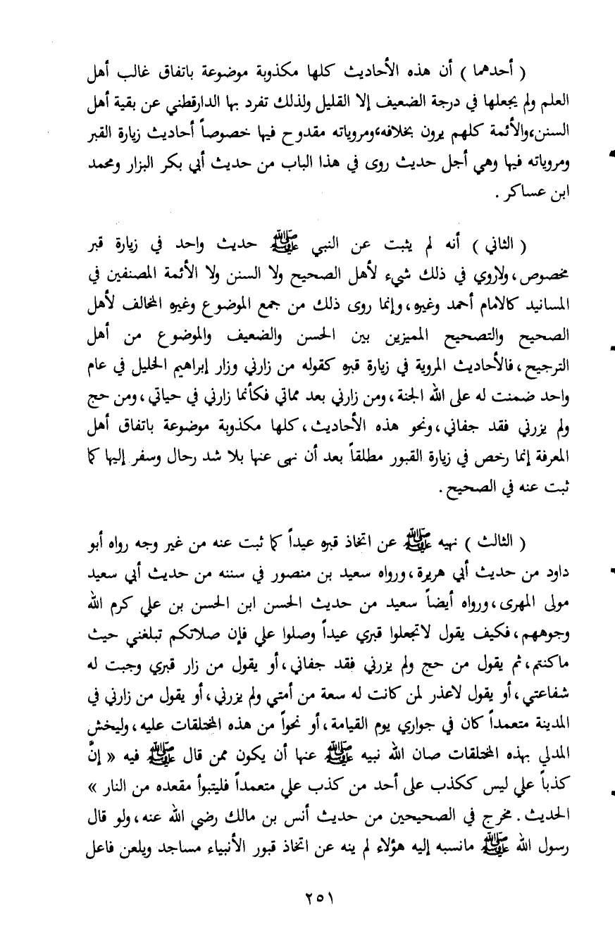 (الثالث) نهيه صلى الله عليه وسلم عن اتخاذ قبره عيداً كما ثبت عنه من غير وجه رواه أبو داود من حديث أبي هريرة، ورواه سعيد بن منصور في سننه من حديث أبي سعيد مولى المهرى، ورواه أيضاً سعيد من حديث الحسن ابن الحسن بن علي كرم الله وجوههم، فكيف يقول لا تجعلوا قبري عيداً وصلوا علي فإن صلاتكم تبلغني حيث ما كنتم، ثم يقول من حج ولم يزرني فقد جفاني، أو يقول من زار قبري وجبت له شفاعتي، أو يقول لا عذر لمن كانت له سعة من أمتي ولم يزرني، أو يقول من زارني في المدينة متعمداً كان في جواري يوم القيامة، أو نحراً من هذه المختلقات عليه، وليخش المدلي بهذه المختلقات صان الله نبيه صلى الله عليه وسلم عنها أن يكون ممن قال صلى الله عليه وسلم فيه "إن كذباً علي ليس ككذب على أحد من كذب علي متعمداً فليتبوأ مقعده من النار" الحديث. مخرج في الصحيحين من حديث أنس بن مالك رضي الله عنه، ولو قال رسول الله صلى الله عليه وسلم ما نسبه إليه هؤلاء لم ينه عن اتخاذ قبور الأنبياء مساجد ويلعن فاعل